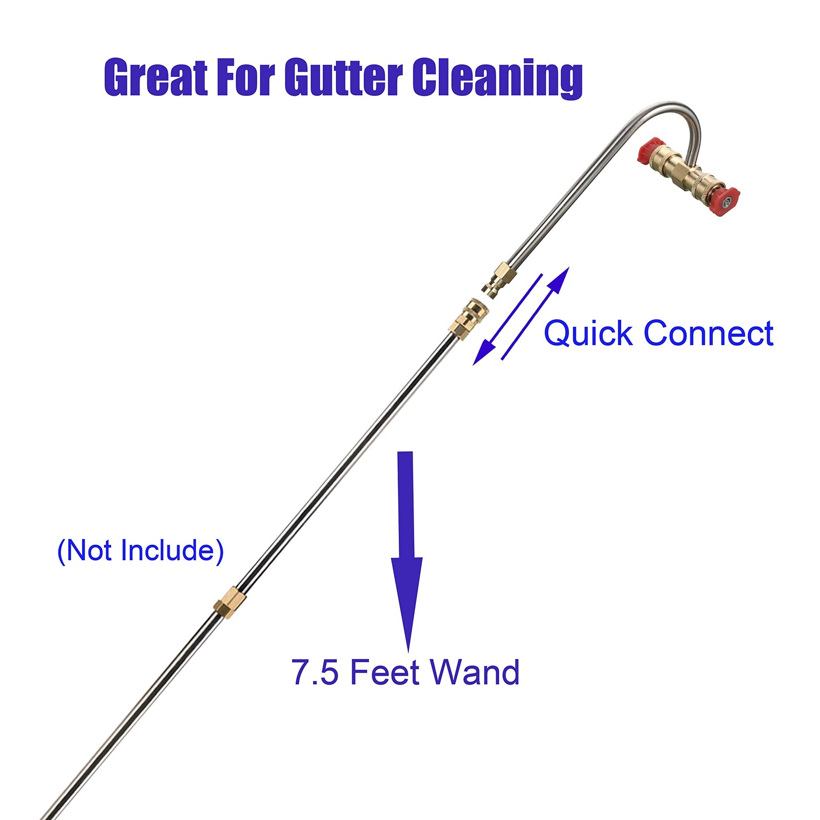Pressure washer gutter cleaner attachment includes 1-piece power washer gutter cleaner, 2-pieces red nozzle tips (0 degree), 2-pieces white nozzle tips (40 degree). Application: Built-in two high-pressure turbo nozzles for blasting away leaves and debris quickly and easily out of your gutters. Ideal for fast and easy cleaning of cluttered and clogged gutters. The working pressure of gutter cleaner tools is rating to 4000 PSI. Pressure washer gutter cleaner attachment is made of brass and stainless steel. Power washer gutter cleaner has 1/4 inch Quick Disconnect and fits most brands of high pressure washer wands. Universal fit for gas or electrical pressure washers. Gutter cleaner for pressure washer can be quickly connected. Easy to install and remove. Pressure washer gutter cleaner attachment includes 1-piece power washer gutter cleaner, 2-pieces red nozzle tips (0 degree), 2-pieces white nozzle tips (40 degree) Application: Install two high-pressure nozzles for blasting away leaves and debris quickly and easily out of your gutters. Ideal for fast and easy cleaning of cluttered and clogged gutters The working pressure of gutter cleaner tools is rating to 4000 PSI. Pressure washer gutter cleaner attachment is made of brass and stainless steel Power washer gutter cleaner has 1/4 inch Quick Disconnect and fits most brands of high pressure washer wands. Universal fit for gas or electrical pressure washers Gutter cleaner for pressure washer can be quickly connected. Easy to install and remove.