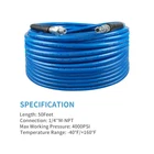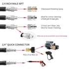★【Package List】The sewer jetter kit include 50 FT sewer jet hose, two orifice 4.5 rotating sewer jet nozzle, orifice 4.0 button nose sewer jetter nozzle, M22 female to 1/4 inch female NPT coupler, Teflon tape and nozzle cleaner. ★【Premium Quality】The inner pipe of the water pipe is a high-quality thermoplastic polyester pipe, the reinforcement layer is composed of chemically bonded 1/4 inch high-strength polyester textile braid, and The Non marking and Never kink permanentlylay cover layer is also a thermoplastic polyester pipe, which can effectively deal with wear, ozone, exposure, oil Impact, thereby extending the life of the product. ★【Excellent Design】The sewer cleaning kit includes three different types of nozzles: the button nozzle has one front nozzle at 0° to remove blockages, and three rear nozzles at 33° to wash away loose debris from the front nozzle. The rotating nozzle rotates the three rear nozzles at 33° for shot peening, sprays water into the blocked pipe, rinses and removes debris. Corner sewer jetter nozzle water sideways to clear blockages at the corner, and six rear nozzles for more powerful cleaning. ★【Special Improvement】We provide you with a Teflon tape that can be wrapped around the water pipe to prevent leakage during use. A nozzle cleaning needle can effectively deal with the problem of nozzle clogging. ★【Quality Assurance】 If you encounter any problems during use, please contect with us in any time. We will provide you with the best service.