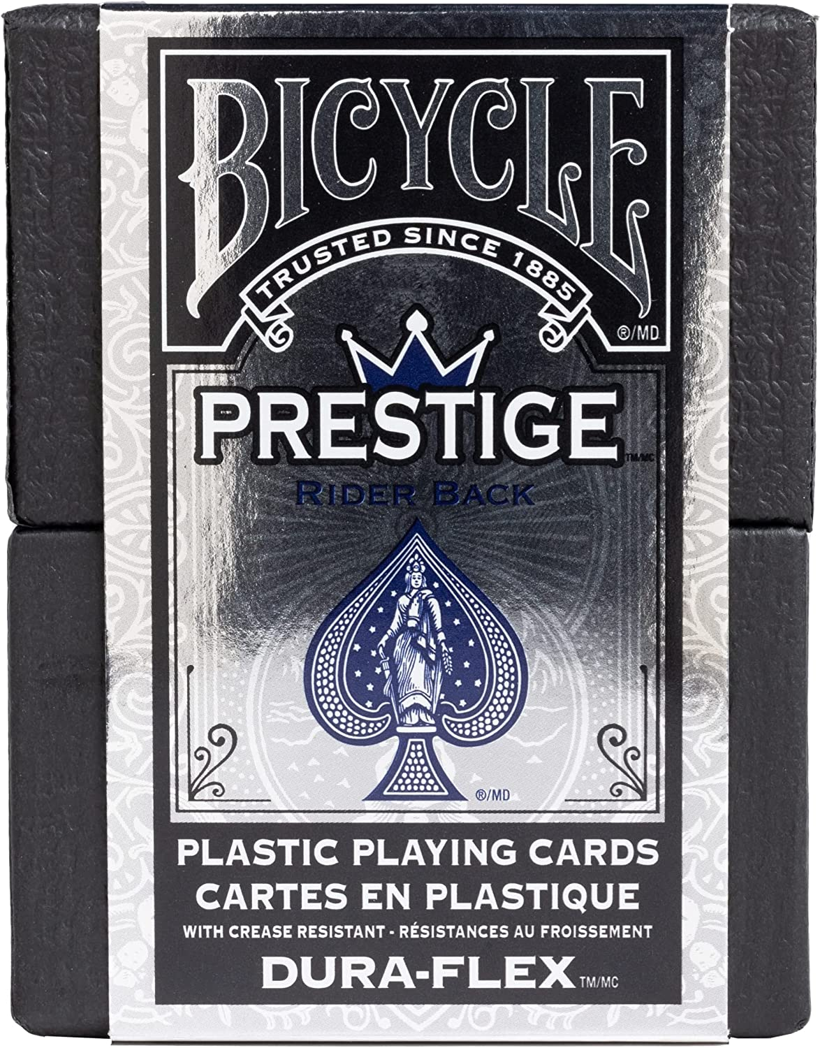 WATERPROOF PLAYING CARDS: Discover Bicycle Prestige Plastic Playing Cards, adorned with the timeless, classic Rider Back design. These durable, waterproof cards provide unparalleled longevity for countless hours of gameplay PLASTIC PLAYING CARDS: Elevate your games with these 100% plastic and waterproof playing cards. Emulating the feel of paper cards, these cards are designed with innovation and resilience, ensuring peak performance and durability in any playing environment TRUSTED BICYCLE QUALITY: Experience the feel of perfection in every game with these high quality playing cards. Each card is engineered with an Air Cushion Finish, providing an easy handling and shuffling experience VERSATILE GAMING: These cards open the door to countless games of skill and chance. From poker and blackjack to euchre, pinochle, rummy, and canasta. Unleash your inner gamer with this versatile deck of playing cards DELUXE PACKAGING: Our Prestige Playing Cards don't just promise an exceptional game experience, they also make a bold statement. Each waterproof deck of cards comes in a premium paper case, embodying the elegance that suits the prestige of your game nights 100-Percent plastic card with a paper-like feel Perfect for a neighborhood game or a professional tournament Air cushioned feel and easy to shuffle Colors Available: Blue or Red Air cushioned feel and easy to shuffle Discover the world of premium card playing with our Bicycle Prestige Plastic Playing Cards. Crafted from high-quality plastic, they strike the perfect balance between durability and a pleasing paper-like touch. Unlike ordinary cards, these are waterproof cards, ensuring longevity and consistent performance. Engineered with an Air Cushion Finish, the cards provide a seamless shuffle, providing for easy handling seamless shuffling. These elegant cards come in a high-quality paper case that complements their excellent craftsmanship, making them a perfect choice for those who desire a sophisticated card-playing experience.