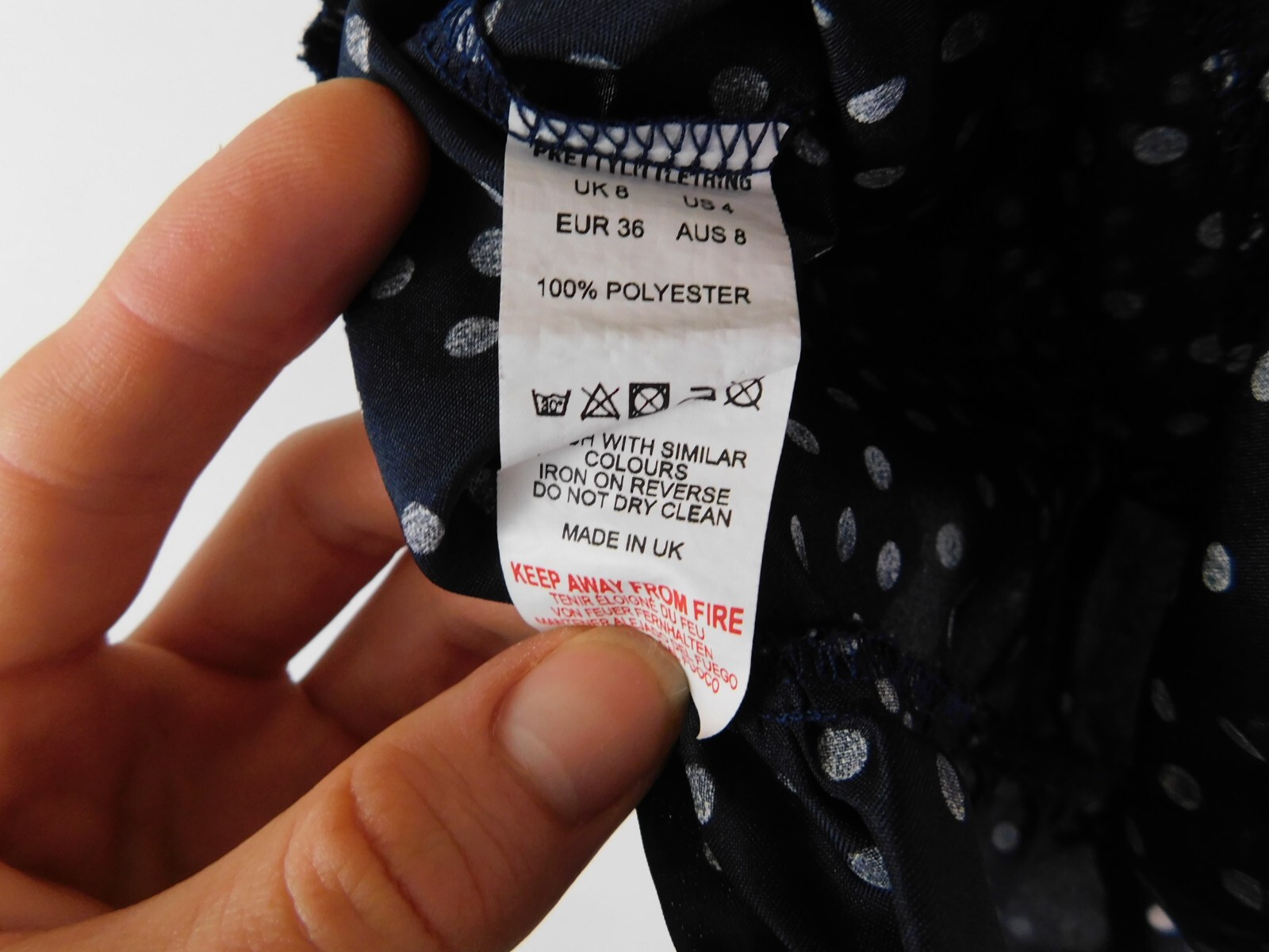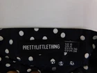 This Pretty Little Thing mini skirt in size 10 features a playful black and white polka dot pattern. The frilled detail adds a flirty touch, making it a perfect choice for a night out or a casual day look. The skirt is made with soft and comfortable rayon fabric, and has a zip closure for easy wear. Its short length and mini style create a fun and trendy silhouette. A great addition to any wardrobe, this skirt is sure to make a statement.