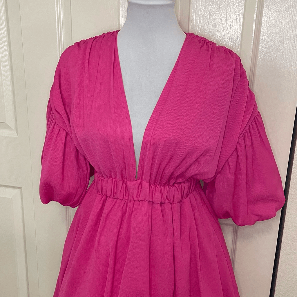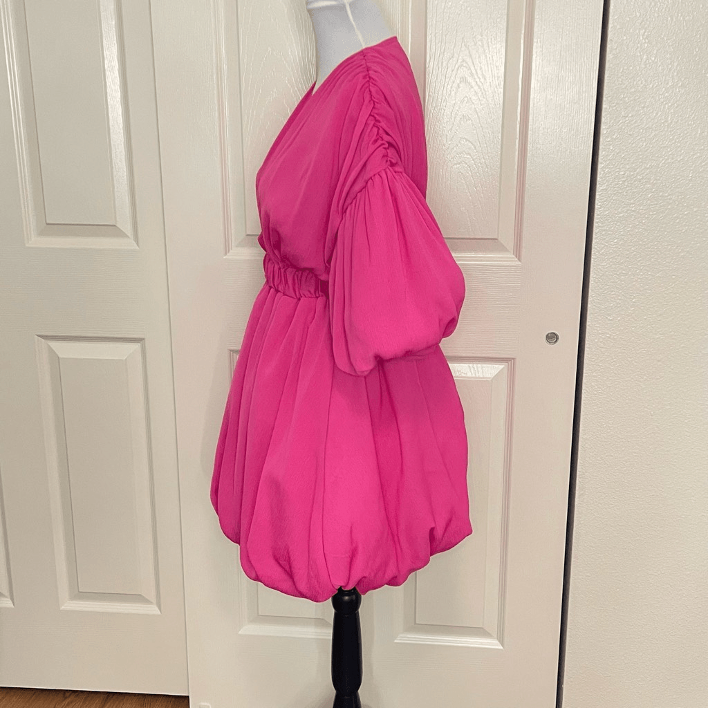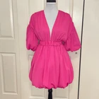 NWT! PrettyLittleThing Fuchsia Barbie Pink Puff Sleeve Puffball Bubble Skirt Hem Shift Dress size 0 Approximate measurements while lying flat are Pit to pit: 16” Shoulder to hem: 32” Waist: 11” Material: 100% polyester Party dress, birthday dress, Barbiecore