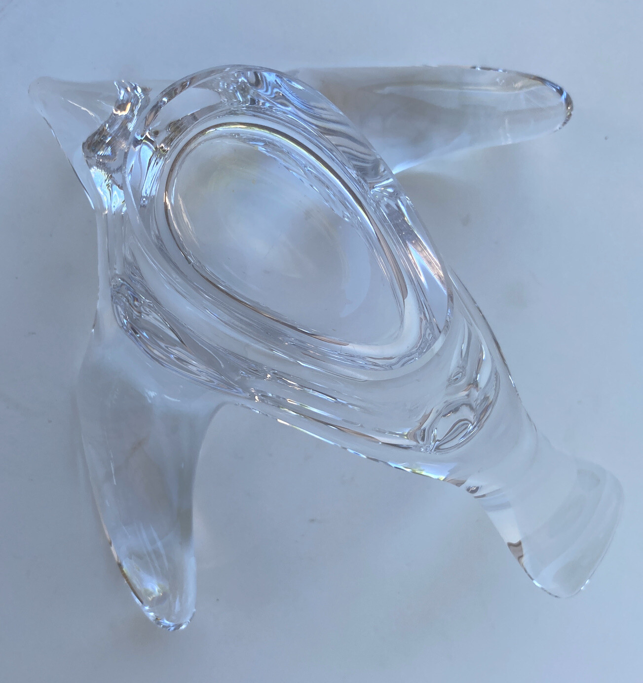 The Princess House art glass Bird dish Dove Bowl is a contemporary candy dish featuring a bird theme. Made of clear glass, this trinket vanity jewelry piece is designed in a sleek and modern style, perfect for adding a touch of elegance to any space. Produced by Princess House, known for their art glass creations, this dish is ideal for holding small trinkets or jewelry in a stylish manner.