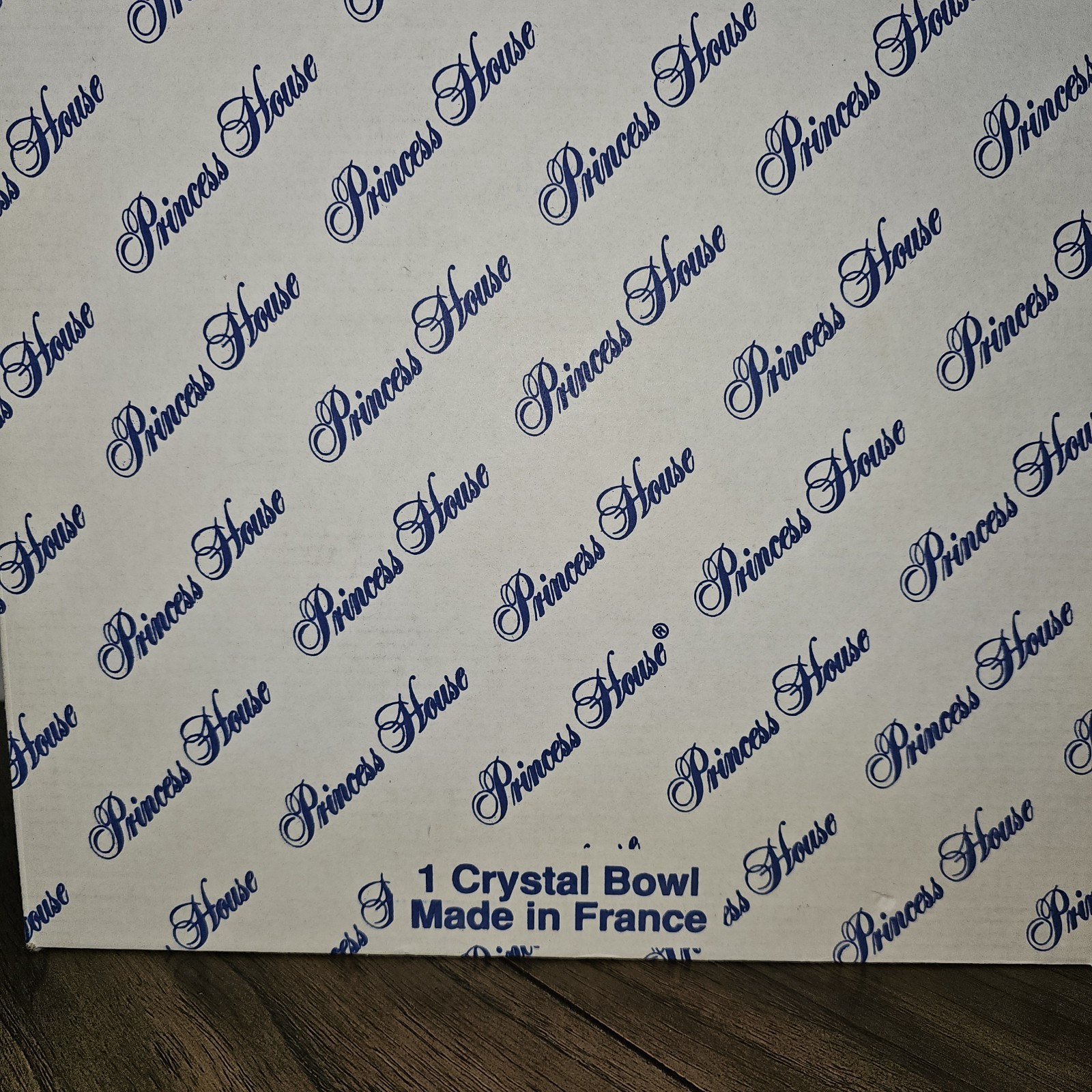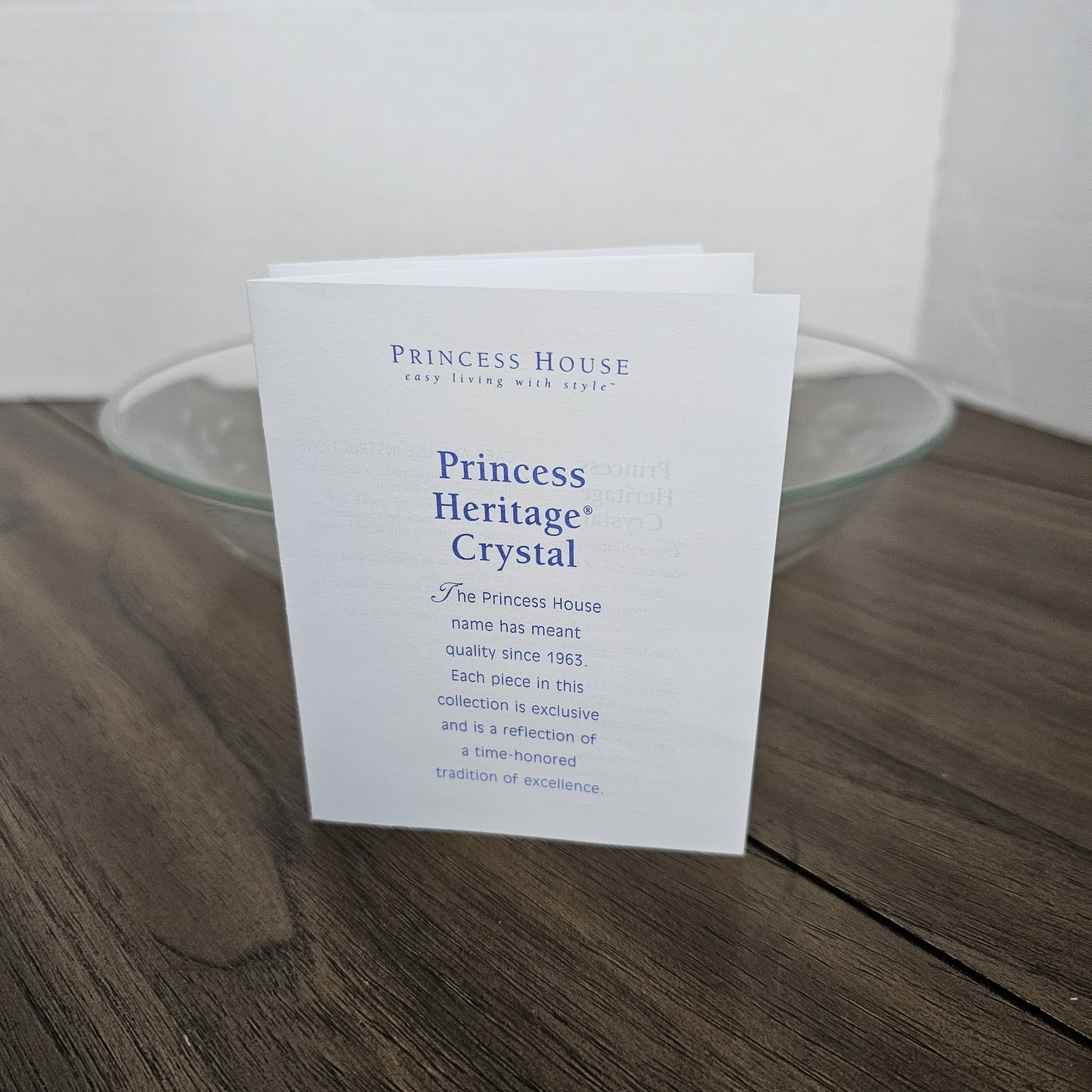 Princess House Heritage Crystal Serving Bowl #340". It is approximately 11 inches in diameter and 3 inches deep. The bowl is made of clear crystal and features etched floral patterns. It was produced in France between the late 1990s and early 2000s. New in box condition, please review all pictures for more details and measurements