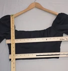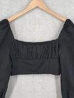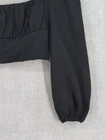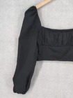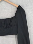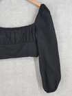 Princess Polly Crop Top Womens US 6 Black Bustier Puff Long Sleeve Square Neck Blouse Condition: Gently worn, no visible flaws Material: 100% recycled polyester Features gathered and ruched front, square neckline, cropped fit, and dramatic puffed long sleeves with elastic cuffs Hidden side zipper for secure fit Tag size US 6 (AU/UK 10, EU 38) – designed for womens Approximate flat measurements shown in photos for accuracy Style is versatile for wearable casual or elevated looks Made from sustainable materials with brand tags visible 14-4085