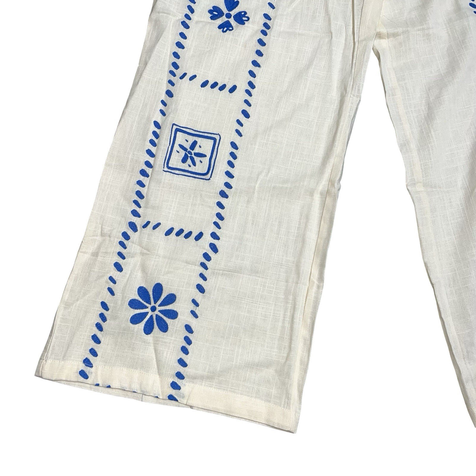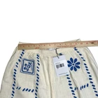 Brand: Princess Polly Item: Womens pants in a pull-on, wide-leg silhouette Tag size: US 4 (AU/UK 8) Color: Cream/Off-White base with Blue embroidered panels Design details: Floral and geometric embroidery running down both legs Features: Elastic waistband; wide leg; lightweight woven fabric with a semi-sheer look Labels/markings: PRINCESS POLLY waist label; retail hangtag attached Style notes: Boho/resort vibe ideal for beach or vacation wear Special notes: Please compare to a similar item for best fit; see photos for details.
