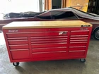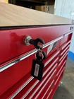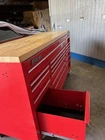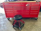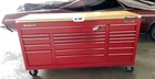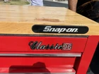 The "Classic 96 Snap-on Tool Box" is a red tool chest and cabinet made of steel. It features a work surface, ball bearing drawer slides, lockable drawers, and wheels for mobility. Suitable for garage or shop use, this tool box is from the Snap-on brand and offers ample storage space for automotive tools and supplies.