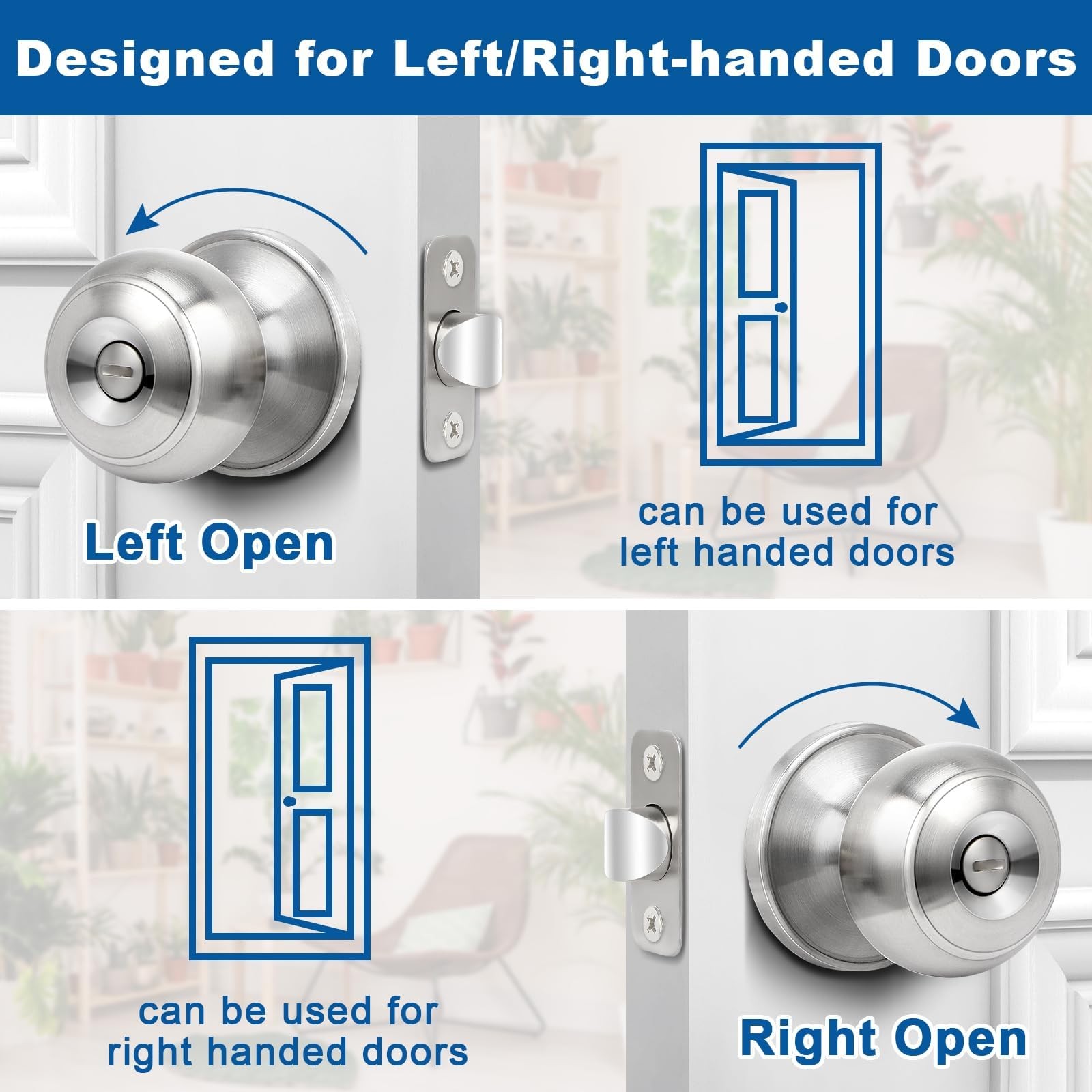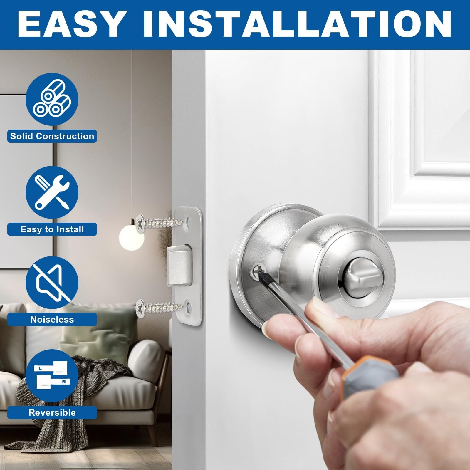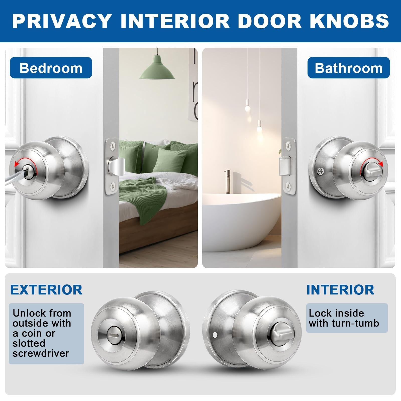10 Pack Brushed Nickel Door Knobs Privacy Interior Door Knob with Lock PRIVACY FUNCTION: The privacy door knobs can be locked by twisting the button inside and opened outside in case of emergency with a flat-tipped tool such as a screwdriver or coin, ideal for use with bedrooms, bathrooms, interior locking doors and other privacy needs EASY INSTALLATION: All door knobs are reversible and can be installed left-handed or right-handed. Privacy door knobs come with all accessories and included installation instructions to help you complete the simple installation of the door knobs lock in less time. Each of door knob is packaged separately to avoid scratches caused by collisions during transit ADJUSTABLE LATCH: Adjustable latch to fit 2 3/8" or 2 3/4" backsets. Fits on 1 3/8" to 1 3/4" thick doors. Please measure the door thickness and backsets before purchasing. Reversible for both left handed and right handed doors. (Notice: The latch plate is unremovable.) PREMIUM QUALITY: Heavy-duty door knob is made of premium quality stainless steel to rust-free in a high humidity environment. Conformed with ANSI Grade 3 Exceeds 200,000 cyles and 5 pins brass tumbler cylinder; Solid Column security bolt for anti-sawing protection CONTEMPORARY DESIGN: Available in a sophisticated, modern door hardware style with simple, unique details to match your home décor
