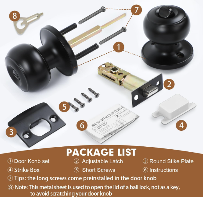 Privacy Door Knobs, 10 Pack Matte Black Door Knobs with Lock, Bed and Bath Door Knob Interior Keyless Locksets, Round Door Handles Reversible for Left Right Handed Doors Material Stainless Steel, Zinc Brand RAZCC Color Black Product Dimensions 6"L x 5"W Exterior Finish Black Handle Type Knob Shape Round Finish Type Black Metal Type Stainless Steel About this item PREMIUM MATERIAL: This flat ball style privacy knob is sturdy and stable which is made of premium quality stainless steel, matte black finish, rust-free in a high humidity environment SPECIFICATION: Fits standard door thickness: 1-3/8"to 1-3/4"(35mm-45mm) and adjustable latch 2-3/8"or 2-3/4"(60mm or 70mm), the latch plate is non-detachable, Black Door handle come with a round strike plate, allows you to replace your existing one PRIVACY FUNCTION: Privacy door knob inside with thumb turning button and outside can unlock the door in emergency with a coin or slotted screwdriver, no key is needed WIDE APPLICATION: This interior door knobs is reversible for both left handed and right handed doors. Designed to completed both conventional and modern style interior doors for bathrooms, bedrooms, offices, rooms or other places privacy required EASY INSTALLATION: Door knob lockset have installation instruction and necessaries fitting components in package, will help you to install it more better, installation in just a few minutes to save your time . We offer FREE shipping on all orders! . We ship within Five business days of payment, usually sooner. . We use a selection of shipping services such as UPS, FedEx, USPS etc. . We only ship to the lower 48 states, no APO/FPO addresses or PO Boxes allowed. . Local pickups and combined shipping options are not provided at this time. . You can return a product for up to 30 days from the date you purchased it. . Any product you return must be in the same condition you received it and in the original packaging. Please keep the receipt. . Your satisfaction is a wonderful reward for our efforts. Please assist us by leaving a positive review if you feel pleased with our service. . In the event that you encounter any difficulties related to your order, please do not hesitate to reach out to us directly through the Messaging system on the Ebay platform. Kindly consider opening a COMPLAINT or a RETURN REQUEST as a last resort, only after all other possible measures have been attempted and we have been unable to provide you with assistance. . We will get in touch with you within 24 hours and make every effort to ensure your satisfaction. . Please rest assured of our service quality.