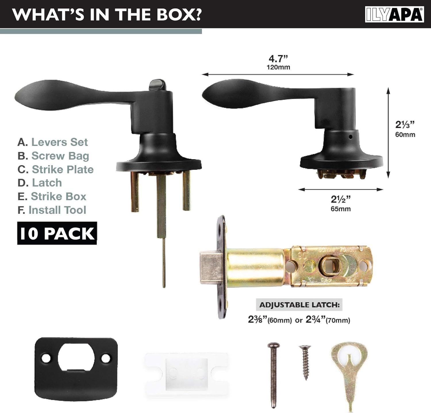 Color: Wave - Privacy Lever Handle Material: Zinc, Brass Hand Orientation: universal Item model number: IL-LVR-PRV-BK-10PK-A Size: 10 Pack Included Components: Screw, Knob Product Dimensions: 2"L x 2.76"W Lock Type: Key Lock gtin13: 313103071052 Brand: Does not apply Batteries Included?: No Item Package Quantity: 1 Special Features: Keyless, Easy to Install UPC: 313103071052 Item Weight: 15.29 pounds Package Type: Standard Packaging Exterior Finish: Brass, Zinc Part Number: IL-LVR-PRV-BK-10PK-A Material: Brass, Zinc Type: Does not apply Style Classic: Handle Type Knob, Lever Number of Items: 10 Metal Type: Zinc Alloy, Brass Special Feature: Keyless, Easy to Install Global Trade Identification Number: 00840013422938, 00840013412748 Unit Count: 10.0 Count Finish: Matte Black,Smooth Shape L-Shaped: Finish Type Matte Black,Smooth Number Of Pieces: 10 Batteries Required?: No