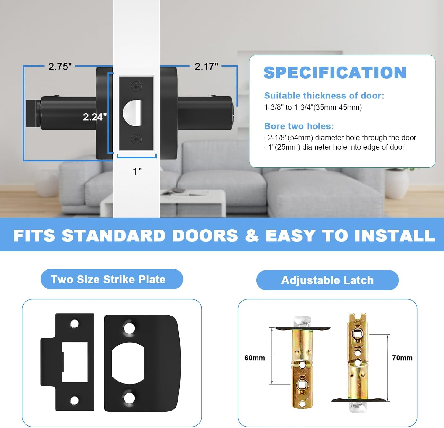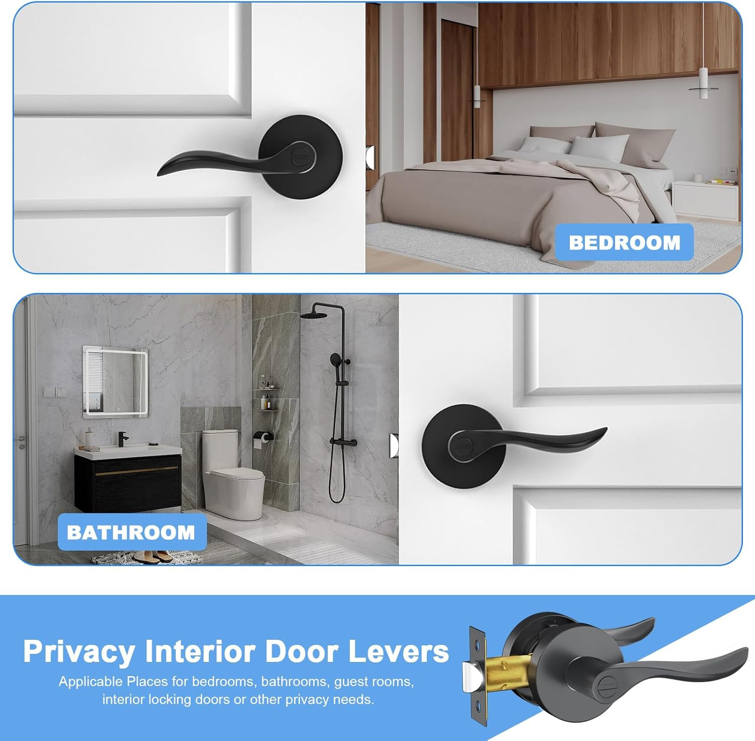 Privacy Door Levers, 8 Pack Black Handles Interior 8 Pack, Product Details Material: Zinc Brand: RAZCC Color: Black Product Dimensions: 5"L x 5"W Exterior Finish: Black Specific Uses For Product: Residential Special Feature: Easy to Install Included Components: Installation accessories and instructions Lock Type: Push Button Lock Metal Type: Zinc Handle Material: Zinc Hand Orientation: Ambidextrous Package Type: Standard Packaging Unit Count: 1.0 Count Number of Items: 8 Manufacturer: RAZCC Room Type: Bedroom, Bathroom Indoor/Outdoor Usage: Indoor Part Number: ZN6205 BLBK-8 Item Weight: 17.46 pounds Country of Origin: China Item model number: Wave Lever Size: 8 Pack Finish: Satin Special Features: Easy to Install Batteries Included?: No Batteries Required?: No Material: Zinc Brand: RAZCC Color: Black Product Dimensions: 5"L x 5"W Exterior Finish: Black StyleHandle Type: ModernLever ShapeFinish Type: RoundSatin PREMIUM MATERIAL: Privacy door handle is sturdy and stable which is made of heavy duty zinc alloy and metal, smooth black finish. Suitable for both conventional and modern style doors SPECIFICATION: Fits standard door thickness: 1-3/8"to 1-3/4"(35mm-45mm) and adjustable latch 2-3/8"or 2-3/4"(60mm or 70mm), the latch plate is non-detachable. Black door handle is come with square and round strike plate, allows you to replace your existing one PRIVACY FUNCTION: Keyless door lever interior with turn button(lock and unlock) and exterior with emergency release button. When you are locked inside, the outside can unlock the door with a coin or slotted screwdriver, no key is needed WIDE APPLICATION: This interior door handles is reversible that means it can be used both on left and right sided. Designed to the interior doors for bathrooms, bedrooms, offices, rooms or other places privacy required EASY INSTALLATION: Door handles lockset have installation instruction and necessaries fitting components in package, will help you to install it more better, installation in just a few minutes with screwdriver to save your time