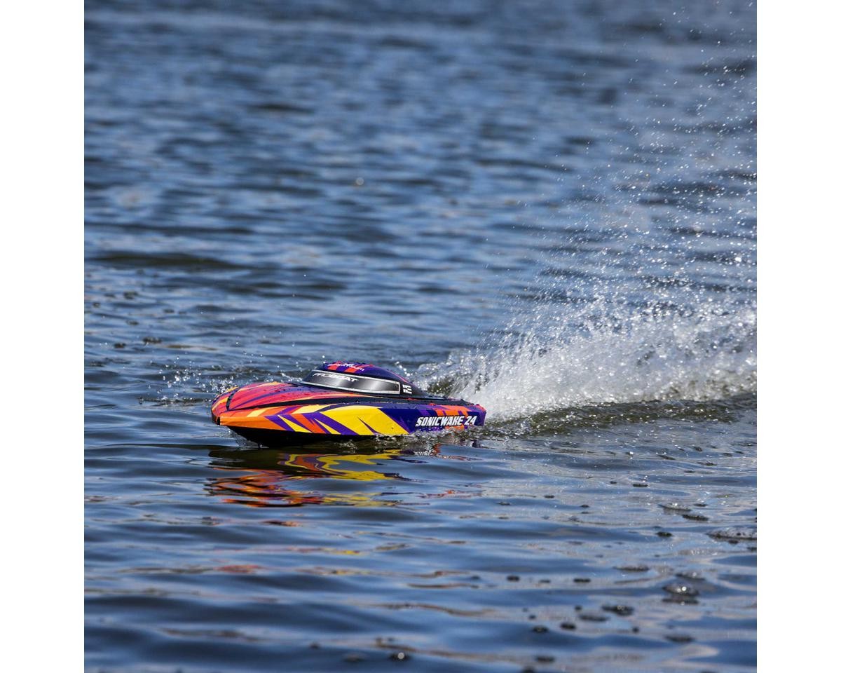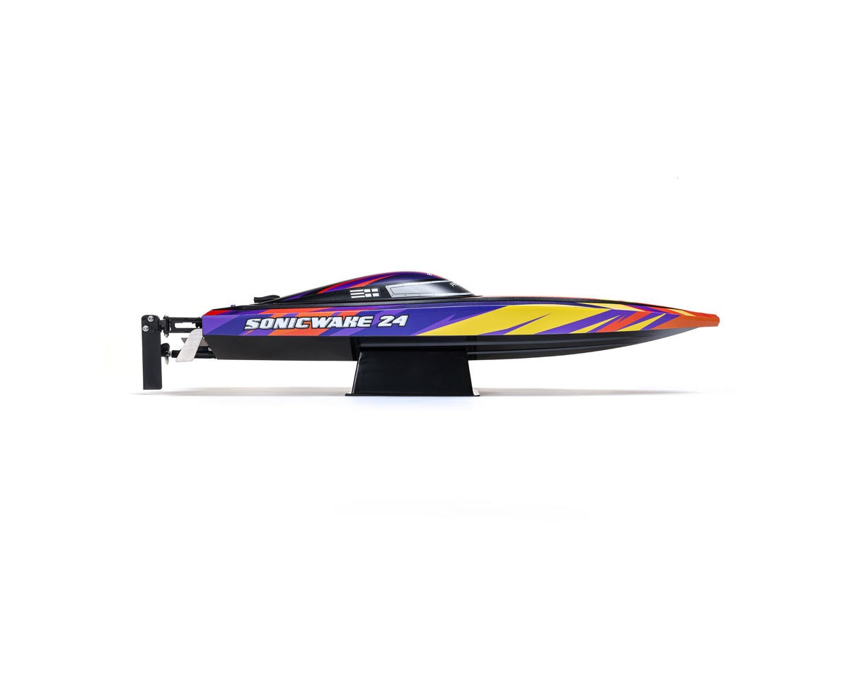 Ready-to-Run Boat with Extreme Brushless Performance Take your RC boating to the next level with the Pro Boat Sonicwake 24" Self-Righting RTR Deep-V Brushless Boat. With thrilling speeds, beginner-friendly features, and a compact size perfect for small ponds or park lakes, this boat blends performance and convenience in a ready-to-run design. Whether you're just getting started in the hobby or are an experienced boater looking for a fast, durable, and easy-to-use model, the Sonicwake 24" delivers serious fun without the need for extra gear or complicated setup. Just charge the battery, add water, and you're ready to rip! About the Sonicwake 24" Boat Powerful Brushless Performance At the heart of the Sonicwake 24" is a factory-installed Spektrum brushless power system built for excitement. The combination of a Spektrum 3542 2500kV Brushless Outrunner Marine Motor and a 50A ESC produces extreme top speeds, making it fast enough to leave a wake behind and get your adrenaline going. Designed with performance in mind, the deep-V hull easily cuts through chop and maintains stability at high speeds, even in rougher water conditions. A Pro Boat servo delivers strong, precise steering for confident control, while the SLT2 2-channel 2.4GHz radio system ensures a responsive connection with minimal interference. Self-Righting Convenience The Sonicwake 24" takes the fear out of flipping with its built-in self-righting hull design. If the boat overturns, it automatically flips itself back upright within seconds, so you won't be stuck retrieving it from the water. This makes it a great choice for less experienced RC boaters, while also allowing seasoned users to push it hard without hesitation. The boat's injection-molded ABS hull and canopy are built to take on hits from rocks or debris, and a breakaway rudder helps prevent damage by swinging away on impact rather than snapping off. Simply push it back in place and continue racing. Smart Battery & Charging System Included with the Sonicwake 24" is a Spektrum 3S 3200mAh 30C Smart LiPo Battery that delivers ample power for high-speed runs, along with an S120 USB-C Smart charger for quick, safe recharging. Just plug the charger into a USB port, connect the battery, and the Smart technology handles the rest. The boat features Pro Boat's SSL (Strap, Slide, Lock) battery system, which makes installing or removing the battery tool-free and hassle-free. Combined, this system offers incredible ease of use and ensures that your boating time is focused on fun, not frustration. Features: Self-righting deep-V hull design for worry-free operation Factory-installed brushless power system capable of thrilling speeds Streamlined molded ABS hull with double-sealed canopy Breakaway rudder swings back on impact to prevent damage High-torque water-resistant steering servo for precise control Spektrum SLT2 2.4GHz radio system with interference-free operation Spektrum Smart-compatible electronics for safer, more efficient charging SSL battery mounting system for quick, tool-free changes Balanced hull size ideal for ponds, small lakes, and tighter spaces Pre-trimmed, ready-to-run setup requiring no assembly or tuning Includes: (1) Sonicwake 24" Self-Righting RTR Deep-V Brushless Boat (1) Pre-Installed Spektrum 3542 2500Kv Brushless Outrunner Marine Motor (1) Pre-Installed Spektrum 50A Smart Brushless Marine ESC w/IC3 Connector (1) Pre-Installed Pro Boat 5.3kg Analog Standard Servo (4.8-6V) (1) Pre-Installed Spektrum SR215 DSMR 2-Channel Sport Receiver (1) Spektrum 3S 3200mAh 30C Smart LiPo Battery (11.1V) w/IC3 Connector (1) Spektrum S120 USB-C Smart Battery Charger (1) Spektrum SLT2 2-Channel 2.4GHz Radio Transmitter (1) Boat Stand (4) AA Batteries for Transmitter Product Manual Needed To Complete: Nothing! Everything you need is included. Specifications: Scale Standard Hull Type V-Hull Power Source 3S LiPo (11.1V) Motor Type Brushless Length 24in (610mm) Width 7.09in (180mm) Height 4.3in (109mm) Weight 45.6oz (1292.74g) Material Injection Molded ABS Completion Level RTR* *Tech Note: Ready-to-Run models come equipped with all electronics and include the transmitter needed for use. Please check the "Needed To Complete" above to make sure you have everything you need to get out and enjoy your RC model. Manuals: User Manual About Us | View Store