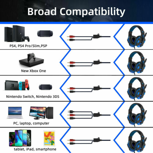 Wireless Gaming Headset for PS4 PS5 Xbox One LED Gaming Headphone Stereo Bass US Item Description Gaming Headset for PS5, PS4, PC, Xbox One, Surround Sound Over Ear Headphones with Mic, LED Light for Mac Laptop Switch PlayStation Xbox Series X/S Audifonos Gamer con Microfono Para PS4 Xbox PC Nintendo Switch Conector 3.5 mm Cascos Gaming PS4 Audifonos Auriculares Gamer PC Xbox One Gamer Con Microfono PS 【Superb Compatibility for Multi-Platform】 This gaming headset supports PS5, PS4, PS4 Pro/Slim, Xbox One, Xbox One S/X controller, PC, Nintendo Switch/3DS, PSP, Game boy advance, Sega dreamcast, Laptop, Computer, Tablet, iPad, Mobile Phone. NOTE: old version Xbox One need extra adapter to support. 【Adjustable Noise-cancellation Microphone】 The gaming headphones are omnidirectional adjustable and flexible to pick up voice in 360 degree. External Audio Control: Mute button and volume control housed on military grade durable braided wire are designed conveniently for quick and convenient adjustment. 【Immersive in Super Real Gaming Experience】 The PS5 headset with high-grade 50mm driver with neodymium magnets delivers clean clear bass and acoustic positioning precision, you can feel the full force of an explosion, a grenade blast, or a dubstep drop. Perfect for Various Games: Like Minecraft, Fortnite, Halo 5 Guardians, Metal Gear Solid, Call of Duty, Star Wars Battlefront, Overwatch, World of Warcraft Legion, etc. 【Humanized Design, Built to Stay Comfortable】 The softly padded retractable headband design allows you to find the perfect fit without constraint and provide excellent durability, suits all gamers at any age. The synthetic leather-wrapped ear-cushions is thicker and bigger which ensures play-all-night comfort! PLUG & PLAY: No setup or installation necessary. 【Uniquely Designed Gorgeous Led Lights】 The Xbox One Headset with big led lights designed on earcups is cool enough to maximize blast the atmosphere of the whole game. The USB interface is only used to supply power to the LED lights on the earcups. Detail Images Shipment All item will be carefully packaged very well with safe material and shipped to US States. Items will be sent in 2 working days,usually shipped by USPS Priority Mail. It will take about 3-5 days to US addresses. If you would like to ship by other shipment methods,please contact us.( shipping cost will be combined for multiple items you purchase at a time.) Payment Only PayPal is acceptable.It is a safe and easy payment method for buyers. Please pay in 48 hours after you win the item(s).If payment cannot be made in five days,your order(s) will be claimed as unpaid case and the item will be relisted. Return & Refund Customer satisfaction is our first priority. 30-days return is available after delivery. However, return shipping and insurance cost will be on buyers. Please email us before returning. Delivery date will be different according to UPS or USPS tracking system, so please inspect your item immediately upon arrival. Money will be return to you after the return item is sent back. We can not refund to you, if your return item is broken or damaged. Please ensure its safety. Feedback Your feedback is very important to us. If you can't leave us a "5-Star" rating and a positive feedback, please contact us without hesitation before leaving feedback. We are eager to work with our customers. We believe in communication. Give us a call or send us an email, we will make things right for our buyers. Positive feedback for our buyers will be left automatically by eBay Seller Manager Pro.