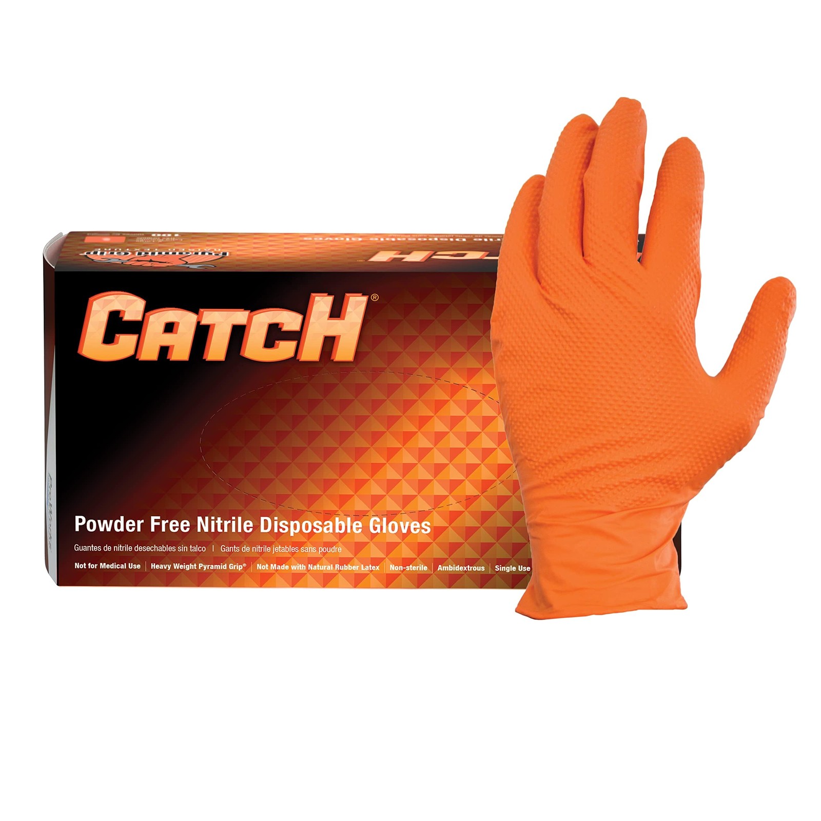 Thick and Durable Non-Latex Gloves: These disposable work gloves are made of 9 mil nitrile designed with a high raised Pyramid Grip for heavy-duty applications and provide extra protection and stronger resistance to wear and tear Latex- and Powder-Free Gloves: These allergy-friendly latex-free gloves are also powder free and offer a unique Raised Pyramid Grip Texture for an extremely secure hold during use High Visibility Disposable Gloves: The vibrant orange color of these disposable nitrile gloves increases hand visibility at the workplace to help enhance safety Great for A Wide Range of Industries: Our gloves are ideal for cleaning, plumbing, painting, automotive, aviation, dairy, ranch, industrial, manufacturing, janitorial, marine, and naval applications Over 26 Years of Quality Gloves: is proud to be a worldwide leader in hand protection products, offering a wide variety of reliable single-use gloves since 1997