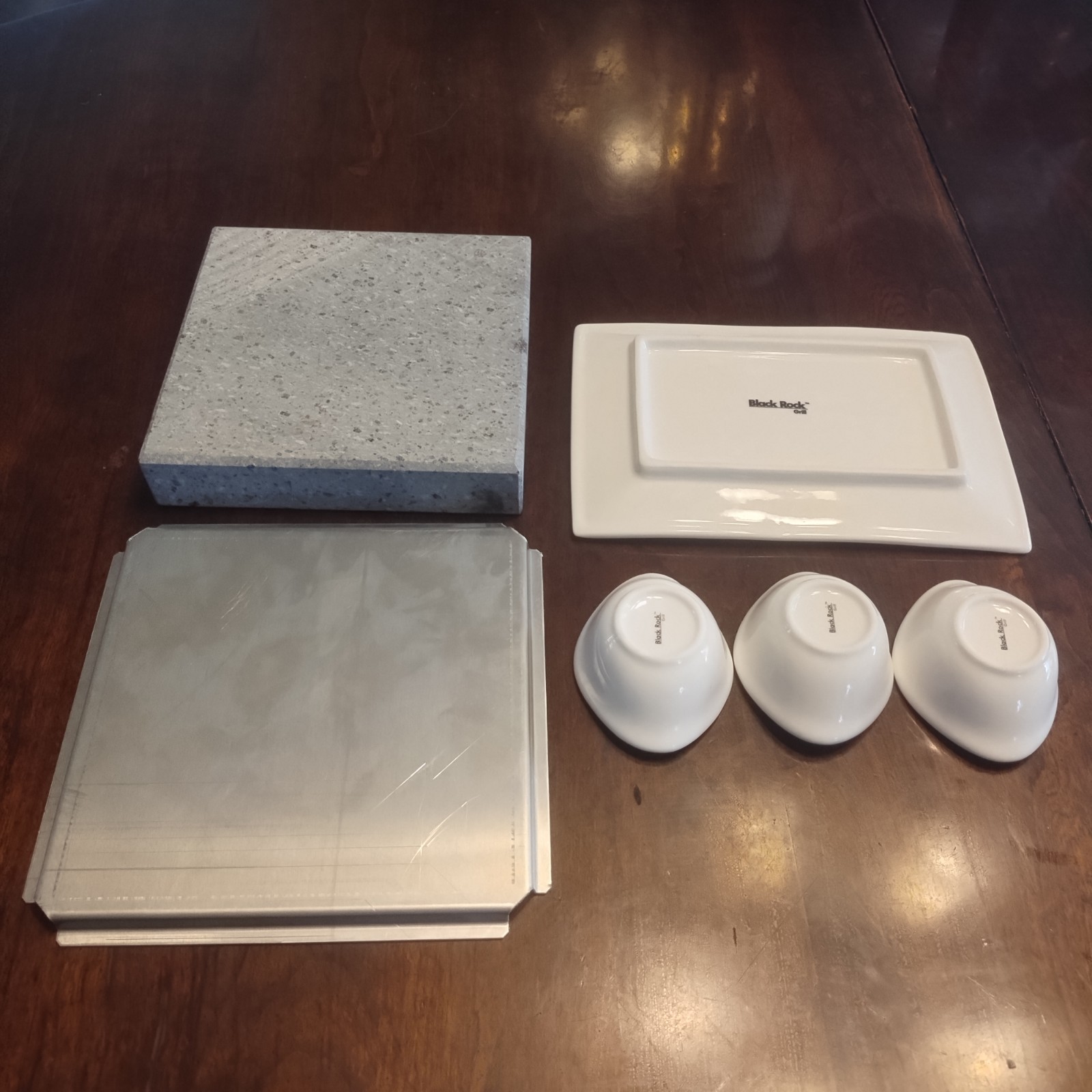 This Black Rock Grill Steak on the stone set is the perfect way to enjoy hot stone dining. You can cook a wide range of food on the steak stone including: fillet steak, rump, sirloin, ribeye, salmon, tuna steaks, prawns, scallops, swordfish, burgers, ribs, fajitas to name a few! Key Features: Rectangular stone for sizeable cuts of meat Attractive white porcelain side plate for chips, salads or vegetables 3 individual dipping pots for a selection of dips, butter or seasoning, will complement the dish Easy to heat up and clean No oil or fat used to make meals healthy One Steak on The Stone Set per person, allowing people to cook their own meal live at the table Sizzling hot till the last bite, your run out of meat before you run of out heat! Size: Cooking Stone (16cm x 16cm x 3.2cm / 6.2in x 6.2in x 1.2in) Metal Under Plate White porcelain rectangle plate (20cm x 11cm x 2cm / 7.8in x 4.3in x 0.7in ) 3 White porcelain dipping pots (8.5cm x 6.5cm 3.5cm / 3.3in x 2.5in x 1.3in) What's in the Box: Standard Set: Cooking Stone Metal Under Plate Porcelain Items Instructions