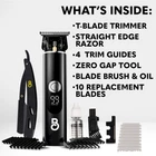 Achieve crisp lines, sharp edges, and barber-quality results at home with T-Blade Trimmer for Men & Straight Razor set. This all-in-one men's grooming kit combines high-performance hair clippers for men (recortadora de pelo) and a stainless steel barber razor (navajas para barbero) —engineered for precision, power, and versatility. The T-Blade Trimmer features zero-gapped , titanium-coated blades designed for ultra-close cuts and clean detailing. Whether you're sculpting a beard, edging a neckline, or shaping sideburns, this T-blade trimmer (recortadora de cuchilla en T) delivers smooth, tug-free performance. The 7,200 RPM motor provides professional-grade cutting power, while the IPX7 waterproof design allows for trimming in or out of the shower. Use it as a cordless hair trimmer , electric shaver , or mustache trimmer for men . The built-in LED display tracks battery life, and the secure travel lock makes it perfect for home, travel, or barbershop use. This beard trimmer for men (recortadora de barba para hombre) offers up to 2 hours of cordless runtime. Customize your grooming routine with 4 guide combs (1 | 1.5 | 2 | 3mm) for sharp fades, tapers, and precise line-ups. It’s a multi-use trimmer for men that doubles as a face trimmer and body groomer. The included straight razor for men is built for barbershop-level detailing. Its ergonomic handle and 10 replaceable derby blades offer smooth shaving control for mustache cleanup, cheek lines, and neckline shaping—true navaja para barbero accuracy. Ideal for those searching for a professional beard trimmer for men , edgers clippers , barber tools , or a premium grooming kit , ’s dual trimmer and razor set delivers serious results. Tame your beard. Define your lines. Elevate your routine. Zero-Gapped Precision for Crisp Lines & Edges - T-Blade beard trimmer for men features zero-gapped, titanium-coated blades for sharp lines, fades, and edging with 4 guide options (1 | 1.5 | 2 | 3mm) Pro-Level Power: 7,200 RPM Motor, LED Display & Travel Lock - High-speed cordless professional hair trimmer with low noise. Built-in LED battery display, 2hr run time, and secure travel lock - ideal for barbers, home use, or travel IPX7 Waterproof Electric Shaver for Wet or Dry Trimming - Fully washable men's trimmer for fast cleanup after shaving, detailing, or beard trimming — great mustache trimmer for men Straight Razor Kit for Barber Level Detailing - Professional stainless steel straight razor for men - 10 replaceable derby blades. Perfect for necklines, cheek lines, and mustaches - navajas para barbero, barber razor, beard razor, or beard liner for men All-in-One Beard Kit & Gift for Men - Complete grooming kit with beard trimmer and barber tools—ideal trimmer for beard, mustache, and facial hair. Great gift for birthdays, anniversaries, Valentine’s, Christmas, Hanukkah & Father’s Day