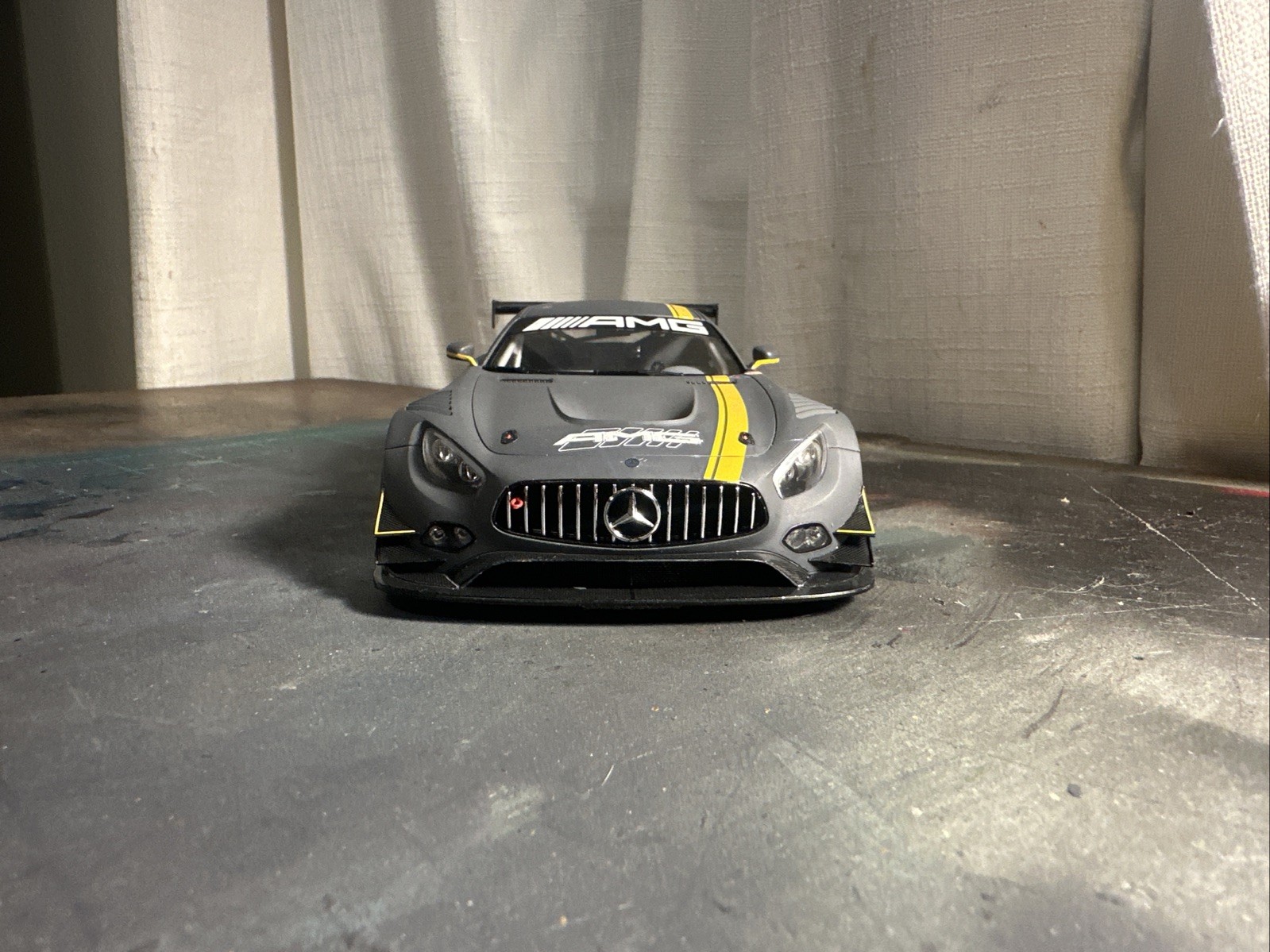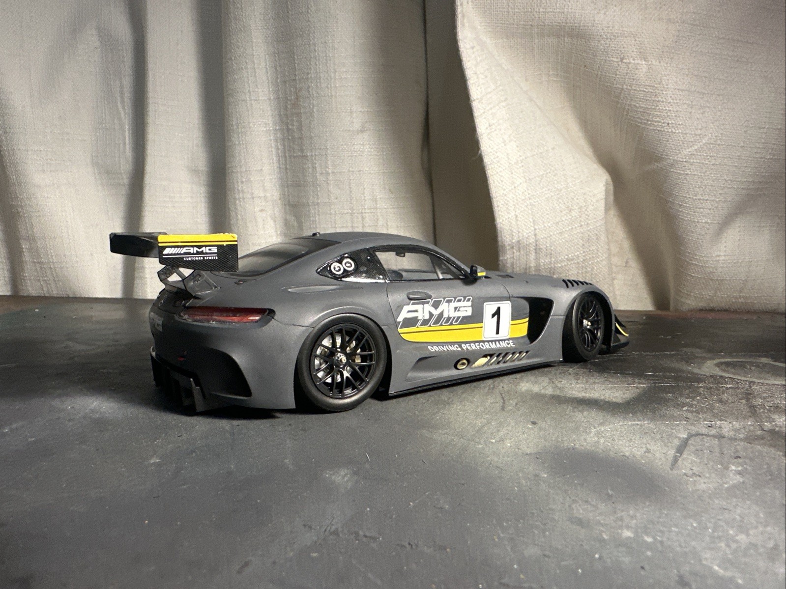 A professionally built 1/35 scale Tamiya Mercedes-Benz AMG GT3 sport car finished in a Matte Black. This model took 28 days to complete and the purchase of news paints and tools for its look and finish. Antenna on the roof of the car will have to be attached by the buyer due to quality concerns with shipping.