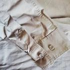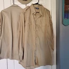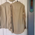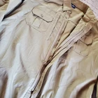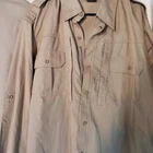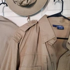 Khaki jacket and long-sleeve shirt set with Safari hat. Multiple pockets on the jacket for convenient storage. Classic khaki color that pairs easily with casual outfits. The shirt is zip-up and button closure as well. The jacket has a small dot on one of the pockets as shown in the last picture, but other than that they are in excellent condition. Please see pictures for details and let me know if you have any questions I ship the next business day