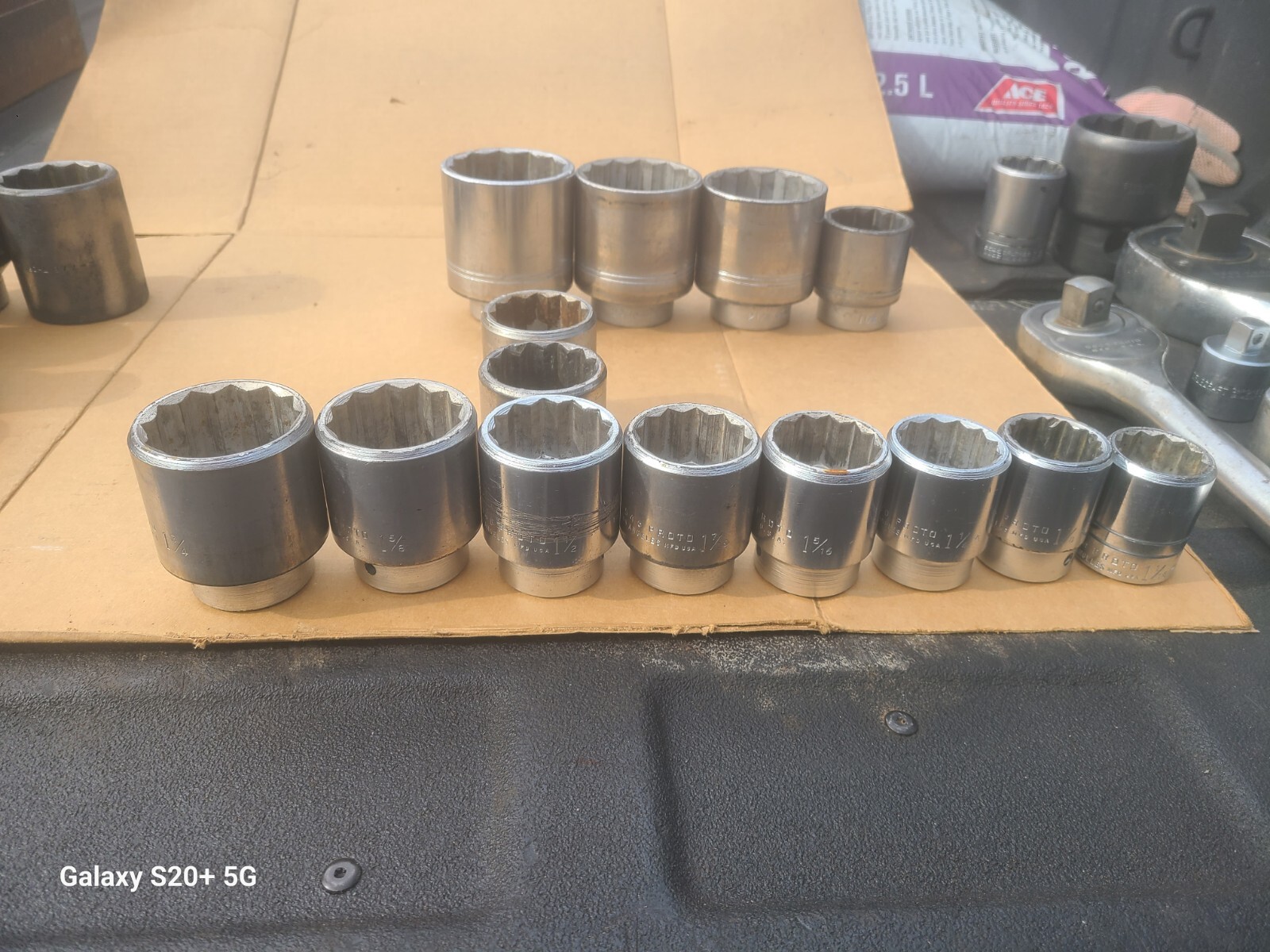 This listing is for all of the large tools listed. The Metal tool tray is not included. There are 2 proto ratchets, 1* & 3/4" plus adapters. Also, a Mac breaker bar. I have posted a picture of the Williams, Proto, and Plumb Sockets included, but there are also some other brands included that are in the first picture on the left. Both ratchets work well, and the sockets are all in good usable condition. They will be shipped in a few boxes to keep the weight down. All of the sockets are 3/4 drive. Once again, you will receive all the sockets and ratchets pictured. Please feel free to ask questions, and thank you for looking...