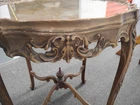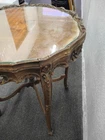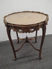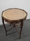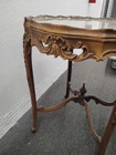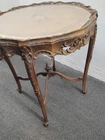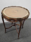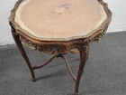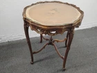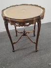 Provincial Ornately Carved Accent Table w. Floral Inlay. Condition is Used. Shipped with USPS Ground Advantage.
