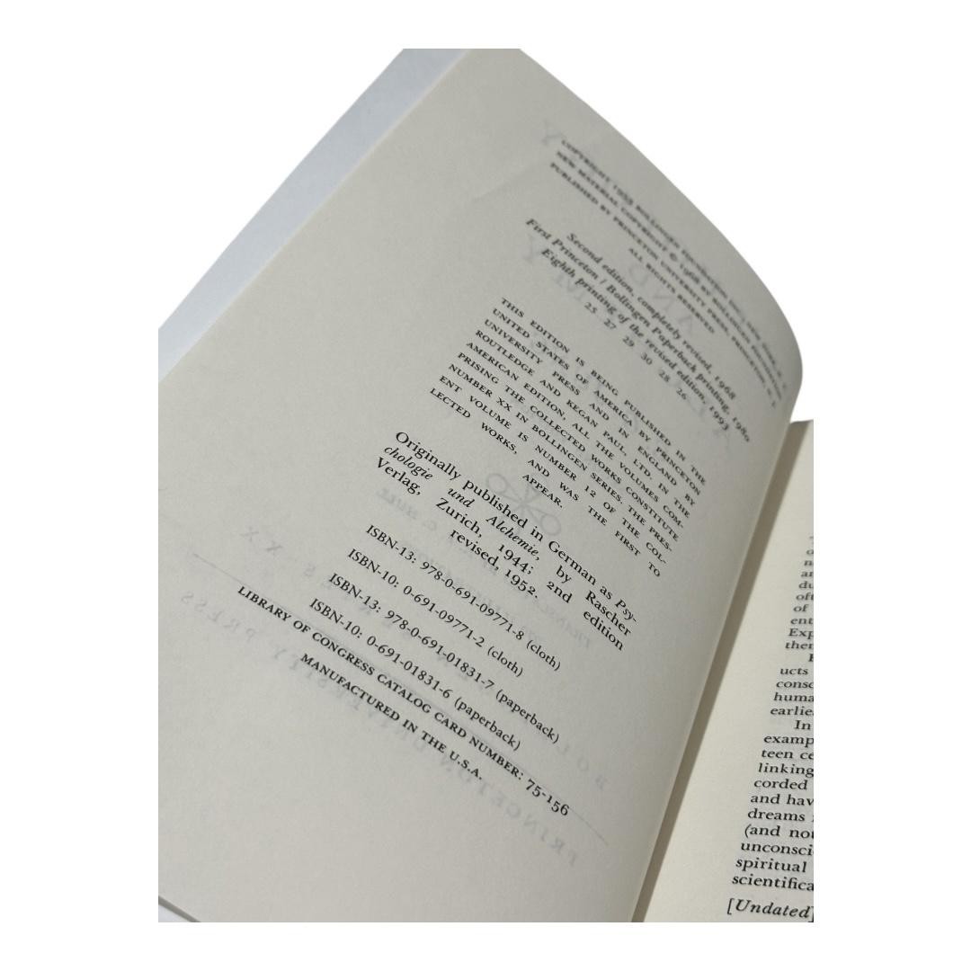 Brand/Publisher: Princeton University Press (Princeton/Bollingen Paperbacks; Bollingen Series XX). Title: Psychology and Alchemy. Authors: Carl Gustav Jung (author); translated from the original German by R. F. C. Hull, presented here as Volume 12 of The Collected Works of C. G. Jung. Format: English-language trade paperback revised edition, complete and unabridged, featuring numerous black-and-white illustrations integrated with the text. Series: Bollingen Series XX, The Collected Works of C. G. Jung, issued as a Princeton/Bollingen paperback designed for scholarly study and long-term reference. Cover: Glossy white softcover with large red "JUNG" lettering and black title text on the front, a black spine with red and white title and series lettering plus Bollingen logo, and a black rear cover with descriptive blurb, series note, and barcode panel. Content: Jung examines the symbolism and literature of medieval and early modern alchemy in relation to analytical psychology, interpreting alchemical images, operations, and texts alongside dreams, case material, and religious motifs to illuminate the processes of the unconscious and individuation. Features: Includes approximately 270 illustrations drawn largely from historical alchemical books and manuscripts, detailed notes, and scholarly apparatus, making it a central volume for the study of Jungian symbolism, religion, and depth psychology. Genre/Topics: Analytical and depth psychology, alchemy and Western esotericism, religious and spiritual symbolism, alternative belief systems, mind-body-spirit studies, and the history of ideas. Language and audience: English translation from the original German, intended for adult readers, scholars, clinicians, and students interested in Jungian psychology, religious studies, symbolism, and the intersection of psychology and spiritual traditions. Identifiers and publication details: ISBN-13 (paperback): 978-0-691-01831-7; ISBN-10 (paperback): 0-691-01831-6; ISBN-13 (cloth): 978-0-691-09771-8; ISBN-10 (cloth): 0-691-09771-2; EAN: 9780691018317 (rear cover barcode); Library of Congress Catalog Card Number: 75-7516; originally published in German as "Psychologie und Alchemie" and manufactured in the U.S.A.
