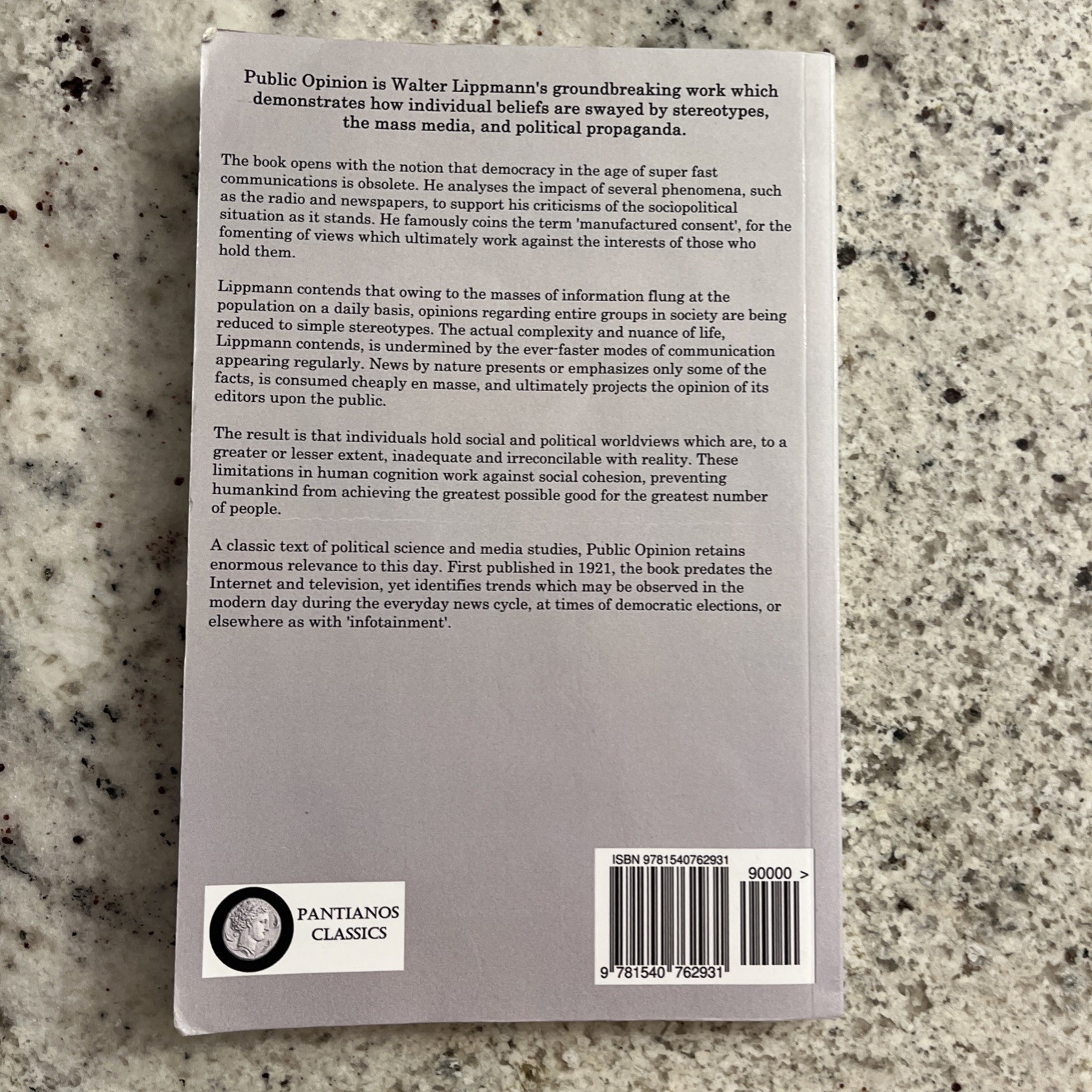Number of Pages:200 PagesPublisher:CreateSpaceFormat:Trade PaperbackItem Weight:12.8 OzLanguage:EnglishDewey Decimal:303.38Publication Year:2016Dewey Edition:21ISBN:1540762939Colour:N/Agtin13:9781540762931EAN:9781540762931ISBN-13:9781540762931Book Title:Public OpinionItem Length:9 inType:Paperback / softbackTopic:Sociology / General, American Government / General, Propaganda, Social PsychologyItem Width:6 inAuthor:Walter. LippmannGenre:Political Science, Social Science, PsychologyIntended Audience:TradeItem Height:0.5 in