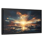"Falling Light, Rising Beauty" – Epic Sunset Landscape Illustration Product Description: Immerse yourself in the breathtaking splendor of " Falling Light, Rising Beauty " , a licensed reproduction of an AI-generated epic sunset landscape by Hypnotik Creations. This panoramic masterpiece captures the golden hues of twilight as they cascade across a tranquil, wide-angle view, blending rich and vivid colors with dramatic light and shadow. The scene radiates beauty and serenity, making it a perfect focal point for your home or office. Expertly printed in HDR on museum-quality cotton-polyester composite gallery-wrapped canvas , this artwork features a special proprietary matte finish coating that enhances detail and guarantees long-lasting vibrancy. Using state-of-the-art printing technology and UL-certified Greenguard Gold inks , the image delivers stunning, eco-friendly clarity while being non-toxic, non-hazardous, and non-flammable. Choose between two elegant display options: with or without the 1.25" solid pine wood frame in black . The handcrafted frame, sustainably sourced and FSC-certified, adds a sleek floating effect, elevating the canvas to gallery-quality perfection. Both options are ready to hang out of the box , with sawtooth hardware pre-attached and rubber dots ensuring the canvas stays securely in place. Whether displayed in a living room, bedroom, or office, " Falling Light, Rising Beauty " is an awe-inspiring piece that brings the magic of nature into any space. Available framed or unframed, this eco-conscious artwork is a timeless investment in style and tranquility. Key Features: Title: " Falling Light, Rising Beauty " by Hypnotik Creations Design: Panoramic sunset landscape featuring epic colors and a dramatic wide-angle view. Material: Museum-quality cotton-polyester composite gallery-wrapped canvas with a proprietary matte finish for vibrant, long-lasting color. Printing: HDR printing with UL-certified Greenguard Gold latex inks ensures eco-friendly, non-toxic, and high-quality imagery. Frame Options: Framed: 1.25" solid black pine wood frame with a floating effect, FSC-certified and sustainably sourced. Unframed: Same premium materials without the frame. Eco-Friendly: Made with sustainable materials and safe, environmentally responsible inks. Ready to Hang: Pre-attached sawtooth hardware and rubber dots for secure installation. Size Variations: Slight deviations of +/- 1/8" (3.2mm) due to production processes. Care Instructions: Wipe gently with a clean, damp cloth to remove dust or smudges. Size Options: 32x16, 48x24, 60x30. Transform your space with the timeless beauty of " Falling Light, Rising Beauty " , a stunning sunset panorama that exudes warmth, elegance, and a sense of wonder. 4o * Shipping to Alaska, Hawaii, and unincorporated territories of the United States can take additional 7 ? 12 business days, weather permitting.