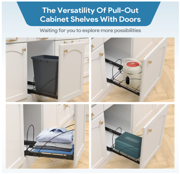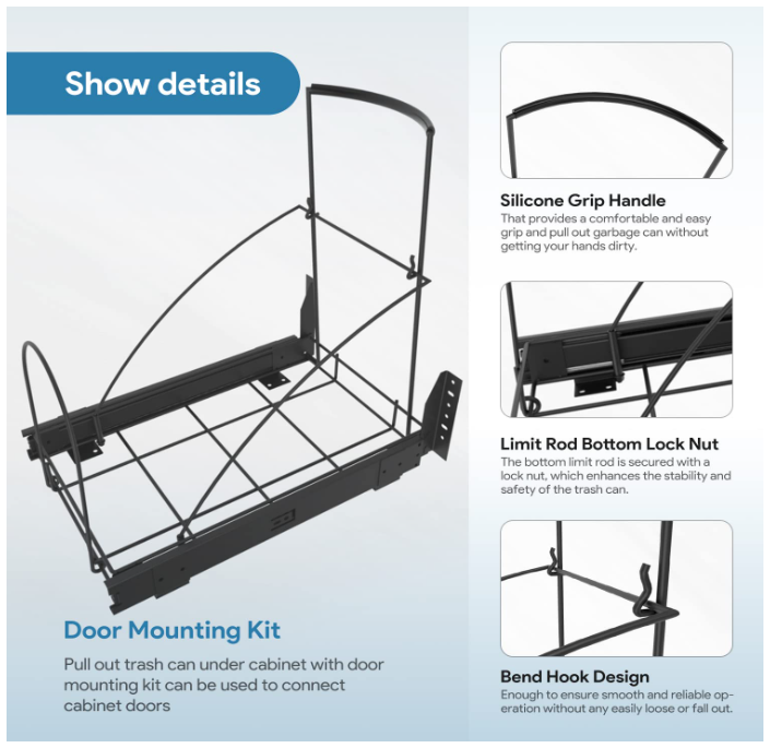 Pull Out Trash Can Under Cabinet,Black Cabinet Trash Can Pull Out Kit with Door Mounting Kit,Heavy Duty Ball-Bearing Slider -Waste Bin Not Included Brand Tanamu Capacity 10 Gallons Color Black Opening Mechanism Pull-Out Material Carbon Steel Recommended Uses For Product Kitchen Room Type Laundry Room, Kitchen, Home Office Special Feature Foldable Shape Rectangular Finish Type Powder Coated About this item 【2 ways to use】1:Pull out trash can under cabinet with door mounting kit can be used to connect cabinet doors.2:Install directly on the bottom of the cabinet without using the door mounting kit.The bottom limit rod is secured with a lock nut, which enhances the stability and safety of the trash can. 【Hidden Design】This cabinet trash can pull out kit is an ideal solution for managing your kitchen waste while saving valuable space. It comes equipped with an arc silicone grip handle that provides a comfortable and easy grip and pull out garbage can without getting your hands dirty. 【Sturdy 】Under the sink trash can is made of high-quality heavy-duty steel with a chrome finish to withstand the wear and tear of daily use,The maximum bearing capacity can reach 70 pounds, Note: not Include Garbage Bin and Cabinet. 【Ball slide】The trash can drawer pull out kit use heavy-duty thickened slide rails provide effortless sliding and make it simple to dispose of garbage without any hassle.The hooks and limit rods are sturdy enough to ensure smooth and reliable operation without any easily loose or fall out. 【Cabinet Requirements】Slide out trash can cabinet mount kit Dimensions: 12"W x 16"D x 16"H; Minimum Cabinet Dimensions Required:14"Wx 18"Dx 18"H. Note: You can add gaskets at the connection of the door mounting kit to prevent the door panel from break through unsightly. The installation height of the trash can slide rail rack under the cabinet door needs to be measured according to the height of the buyer's trash can. . We offer FREE shipping on all orders! . We ship within Five business days of payment, usually sooner. . We use a selection of shipping services such as UPS, FedEx, USPS etc. . We only ship to the lower 48 states, no APO/FPO addresses or PO Boxes allowed. . Local pickups and combined shipping options are not provided at this time. . Your satisfaction is a wonderful reward for our efforts. Please assist us by leaving a positive review if you feel pleased with our service. . In the event that you encounter any difficulties related to your order, please do not hesitate to reach out to us directly through the Messaging system on the Ebay platform. Kindly consider opening a COMPLAINT or a RETURN REQUEST as a last resort, only after all other possible measures have been attempted and we have been unable to provide you with assistance. . We will get in touch with you within 24 hours and make every effort to ensure your satisfaction. . Please rest assured of our service quality.
