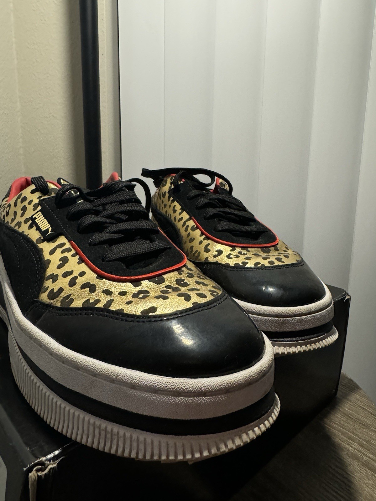 The Puma Charlotte Olympia Shoes in size 10 are a stylish and trendy athletic sneaker designed for women. These leather shoes feature a black base with gold accents and a leopard print design, adding a touch of glam to your outfit. The Puma Deva model is part of the Puma Deva product line, known for its fashionable and comfortable footwear options released in 2020. Perfect for adding a bold and bold statement to your wardrobe, these shoes combine luxury and sportiness effortlessly.