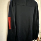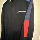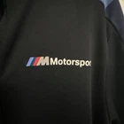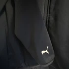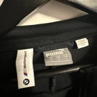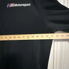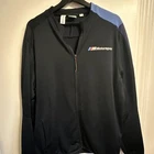 This is a Puma X BMW Motorsport M Series Track Jacket for men in size Large. The jacket is made of a Cotton Blend material with a solid black color. It features a full zip closure, long sleeves, and an athletic fit. The design includes BMW Motorsport and Puma logos, making it suitable for activewear and performance activities like walking, driving, and racing in various seasons.