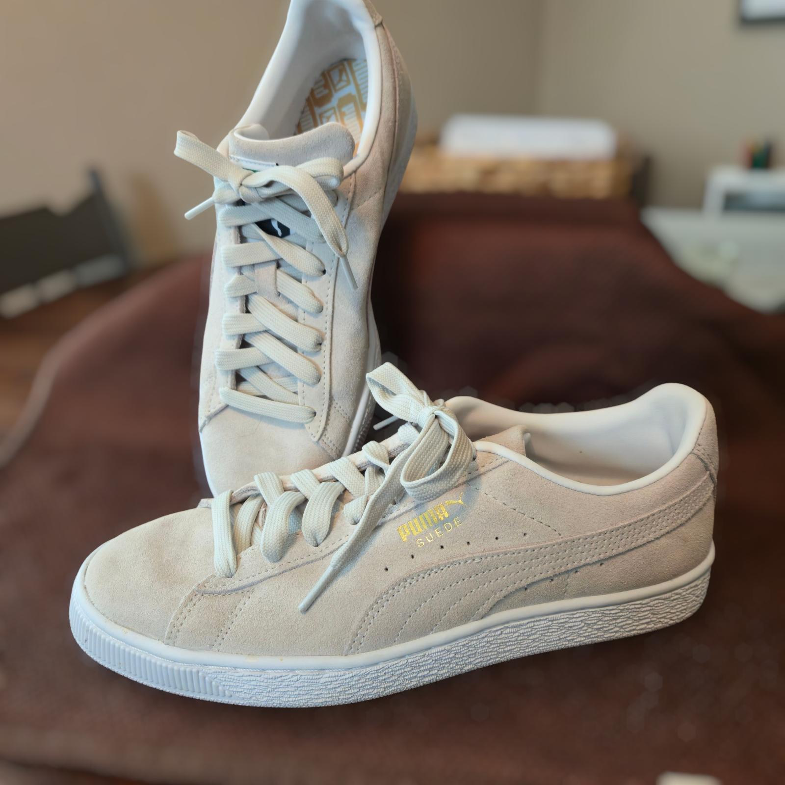 The product is a pair of Puma suede men's shoes in size 8.5 (UK 7.5). These sneakers feature a low top design with a solid beige color, made of suede material with a rubber outsole. They are perfect for casual occasions and walking activities, showcasing the stylish and comfortable Puma Suede model. Ideal for men who appreciate athletic footwear with a classic sneaker style.