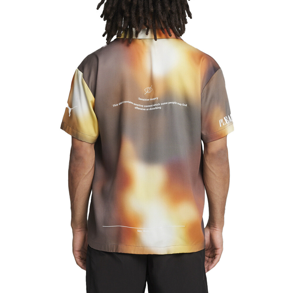 Graphic Collared Short Sleeve Button Up Shirt x Pleasures Product Details Relaxed fit 190 grams per square meter, twill weave Collared neckline Button placket All-over graphic print Welcome Puma x Pleasures. Streetwear brand Pleasures was founded in Los Angeles in 2015 and they're known for their punk and grunge take on contemporary fashion. This season, styles take on motorsport cues with contoured designs and engineered materials that are all about the technical details, and this shirt, with a relaxed fit, wild all-over-print, as well as a collar and button placket reflects that scene. Additional Details Color: Multi Occasion: Casual Gender: Mens Age: Adult Brand: Puma