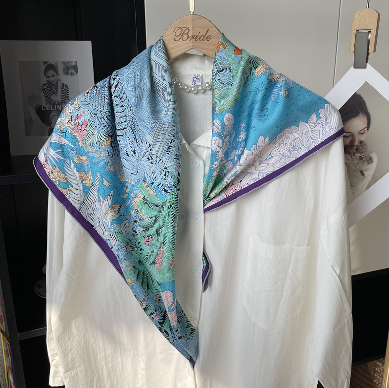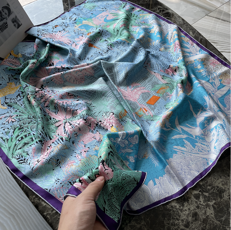 Pure 18 Momme Twill Silk Bandanna Scarf Wrap arboretum Print Square Shawl 35''