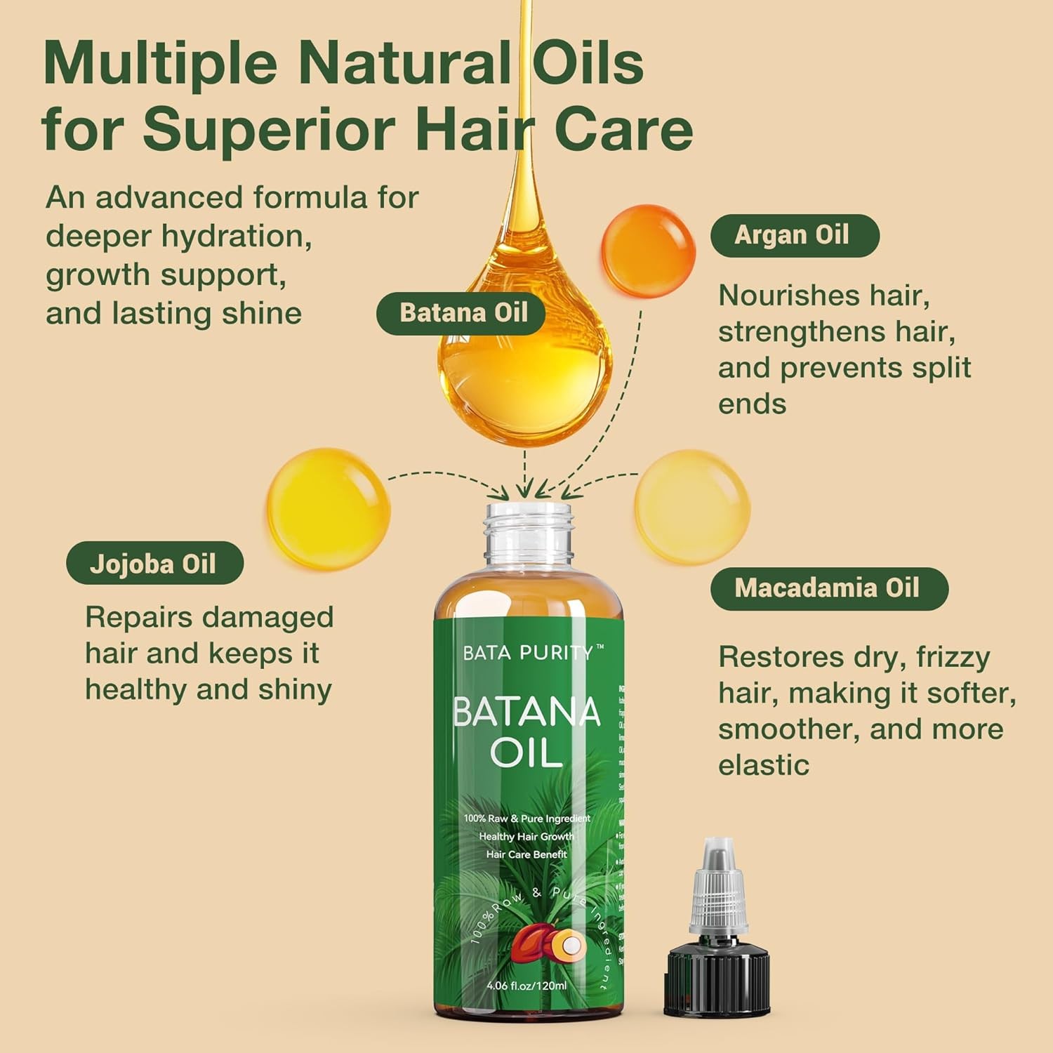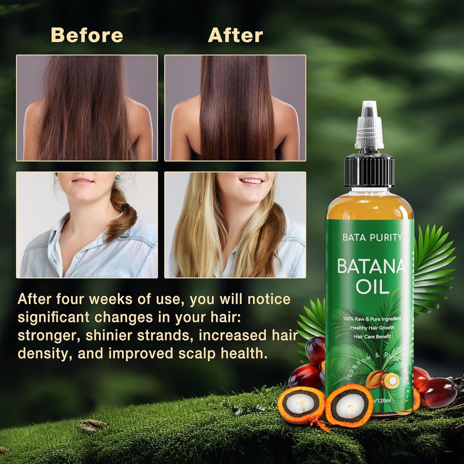 Batana Oil for Hair Growth - Pure and Natural Raw from Product Details Package Dimensions : 6.5 x 2 x 2 inches; 11.22 ounces Manufacturer : Bata Purity Brand: Bata Purity Item Form: Oil Age Range (Description): Adult Hair Type: All Number of Items: 1 Deep Repair & Natural Shine: Batana oil for hair growth is enriched with natural fatty acids and antioxidants to deeply nourish and repair dry, brittle hair. With regular use, your hair regains its radiance, softness, and vitality. This pure Batana oil is suitable for all hair types and helps restore natural luster. Infused with a delicate fragrance, it leaves your hair smelling as beautiful as it looks Boosts Hair Growth & Reduces Hair Loss: Packed with essential nutrients, this Batana oil activates hair follicles, supports healthy regrowth, and helps reduce hair thinning. Whether dealing with a receding hairline or weak strands, this hair growth oil nourishes the scalp, making it ideal for both men and women seeking fuller, stronger hair Multi-Purpose Skincare Oil – Nourishing & Fragrant: More than just a hair treatment, Batana oil is a luxurious skincare solution. It deeply hydrates and soothes dry, cracked, and sensitive skin, leaving it soft and refreshed. The light, pleasant fragrance enhances your self-care routine, making each application a sensory experience Pure & Free From Harsh Chemicals – Suitable for All Hair Types: This Batana oil is free from sulfates and parabens, ensuring a gentle, safe experience for all hair types. Whether your hair is dry, damaged, or fragile, this nourishing formula repairs, strengthens, and revitalizes without irritation—all while leaving behind an elegant scent Visible Results With Consistent Use: With regular application, you’ll notice stronger, healthier hair in just a few weeks. This Batana oil helps reduce split ends, improve elasticity, and restore moisture for a fuller, more vibrant look. Enjoy the benefits of hair and scalp nourishment with a long-lasting, luxurious fragrance