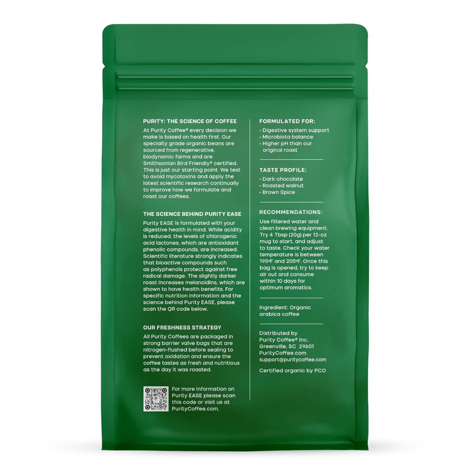 Purity Coffee – Dark Chocolate Organic Dark Roast Ground Coffee (12 oz) Low-Acid Coffee Crafted for Wellness Enjoy the perfect balance of full-bodied flavor and digestive support . Purity Coffee Dark Roast is high in antioxidants, lower in acidity, and contains prebiotic compounds to support gut health and overall wellness. Certified Organic & Regeneratively Farmed USDA Organic Certified Demeter Certified Biodynamic Smithsonian Bird Friendly Every batch is specialty-grade, regeneratively farmed, and hand-picked to ensure the highest quality beans with exceptional health benefits. Flavor Profile Top Notes: Brown spice Mid Notes: Roasted walnut Base Notes: Dark chocolate Zero Additives, Pure Coffee Purity Coffee contains 100% specialty-grade organic Arabica beans with no additives or allergens. Lab-tested for antioxidant content, it’s coffee designed with your health in mind. Brewing Recommendations This medium-fine grind is ideal for electric drip machines, manual pour-over, Aeropress, or Clever Dripper . Use filtered water at 195–205°F and start with 4 Tbsp (20g) per 12-oz mug —adjust to taste. Once opened, store airtight and consume within 10 days for peak freshness. For cold brew lovers, try Purity EASE for smooth, easy-to-digest coffee. Freshness You Can Taste Packaging is nitrogen-flushed to reduce oxygen to 1–2%, preserving coffee oils, aroma, and flavor. Each 12 oz bag yields approximately 25–30 cups of coffee. Coffee Crafted for Wellness From farm to cup, Purity Coffee focuses on maximizing health benefits without compromising taste. Enjoy a dark roast that’s smooth, antioxidant-rich, and supportive of your gut and overall wellness . Ingredients: 100% Specialty-Grade Organic Arabica Coffee