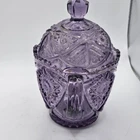 This vintage candy dish is a stunning addition to any collection. The ornate design features an etched cut glass lid and is made of high-quality glass material. The dish is perfect for storing candies, nuts, or other small items. The brand is unmarked, adding to the unique and timeless appeal of the piece. The production style is cut glass, a technique that adds depth and texture to the dish. The purple color is rich and vibrant, making it a standout item on any tabletop. This candy dish is a must-have for collectors of vintage glassware. There is a rough edge along rim... feels like chipping. Sold as is
