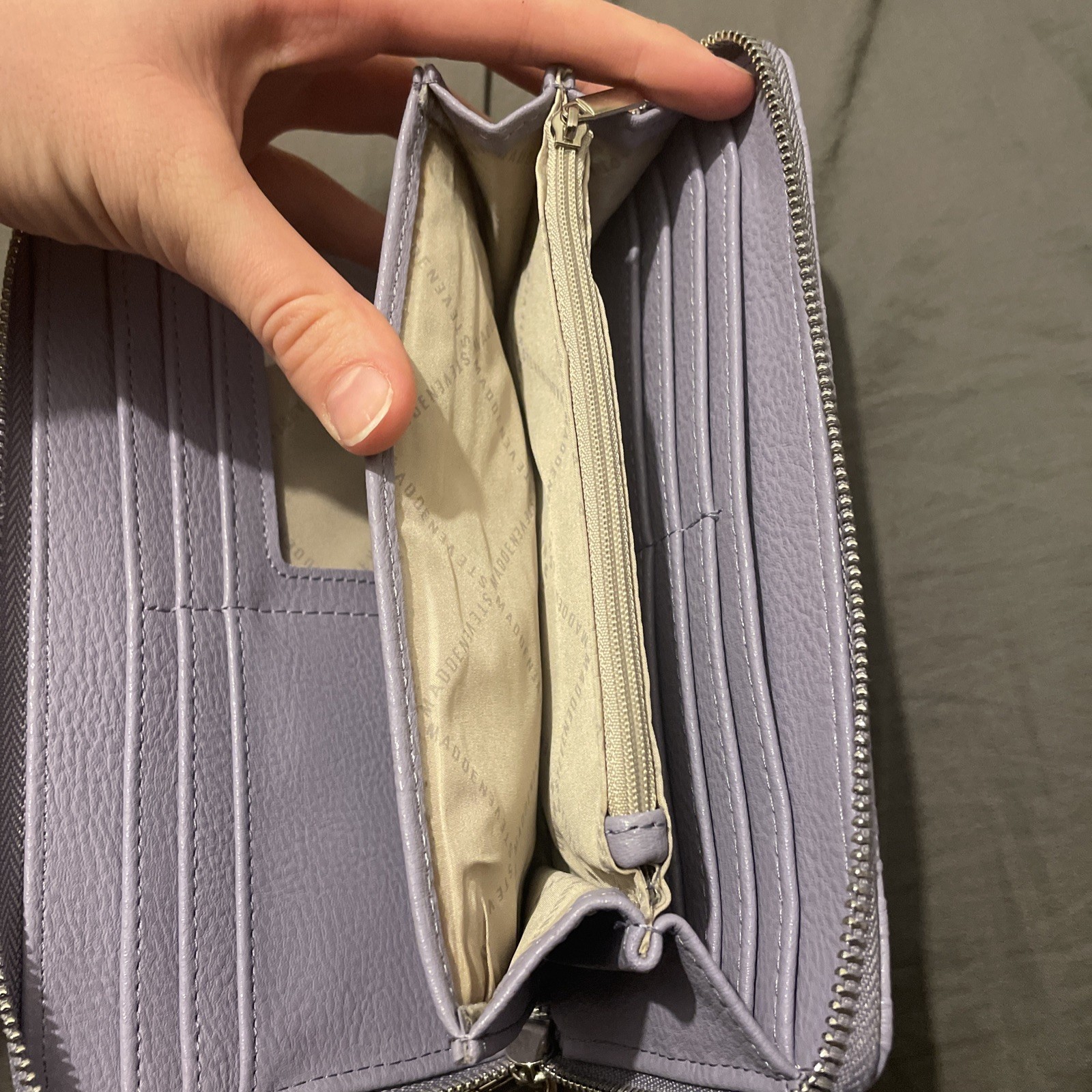 Country of Origin:ChinaBrand:Steve MaddenDepartment:WomenType:WristletStyle:WristletTheme:Stamped LogoMaterial:Faux LeatherFeatures:Zip-AroundColor:Purple