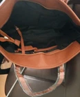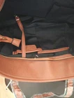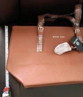 The Micky Ken purse is a large, rectangular-shaped bag with a zip closure and inside ipper compartments and key clip strap. brown leather handles/straps. It features a logo pattern, gold hardware accents, and a buckle accent. The exterior is made of leather with a fabric lining in black. This tote style purse is suitable for travel, casual outings, workwear, and business settings, making it a versatile accessory for women. The Micky Ken brand adds a touch of sophistication to this stylish and practical handbag.