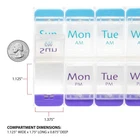 Weekly Planner - 7-Day AM/PM Planner - This AM/PM Weekly Organizer is perfect for Scheduling your week's . Its push buttons and transparent lid are simple To use and help you keep track of your through the Week, This 7-Day Planner is designed for easy use. Its buttons and rounded bottom make it easy to open and retrieve medications. Separate AM/PM compartments make it easy to organize taken twice a day. The product's clear lid allows easy visibility of to help prevent missing doses.The main features of the 7-Day AM/PM Planner include: Easy use - push buttons and rounded bottoms make the planner easy to open and easy to retrieve, day and night Reminders - Easily plan your twice a day doses, clear lid - allows easy visibility of medications to help prevent any missed doses, large compartments - Each compartment can fit 30 aspirin and has plenty of room for all of your daily medications. Product Recommended by the Arthritis Foundation and is great for anyone with dexterity problems! About : is the leader in easy-to-use management products. Many of our push-button planners are endorsed by the Arthritis Foundation for our ease-of-use design. products make living healthier simply easier with products like cutters, crushers and a full line of easy-fill planners. 7 DAY ORGANIZER: AM/PM compartments help you to easily plan and distribute your daily doses EASY USE: Keep visible and help prevent missed doses CAPACITY: Holds up to 30 per compartment (aspirin-sized) BUILT TO LAST: Quality design, Built to withstand repeated use HEALTHY LIVING: products make living healthier simply easier
