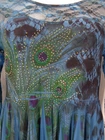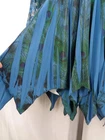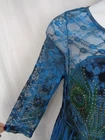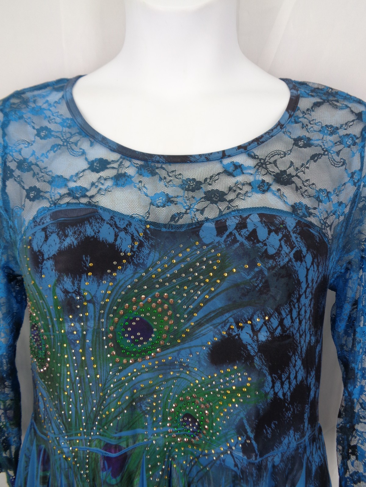 The Pyramid Collection Tunic Top No size tag, maybe small...measurements below Shades of blue & black peacock print Lace neckline & sleeves Studded rhinestone front Handkerchief hem No material or care tags Approximate measurements laid flat: Underarm to underarm: 17" Sleeve length: 19" Length (front shoulder to shortest point): 28-1/2" Length (front shoulder to longest point): 34-1/2"