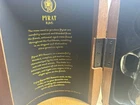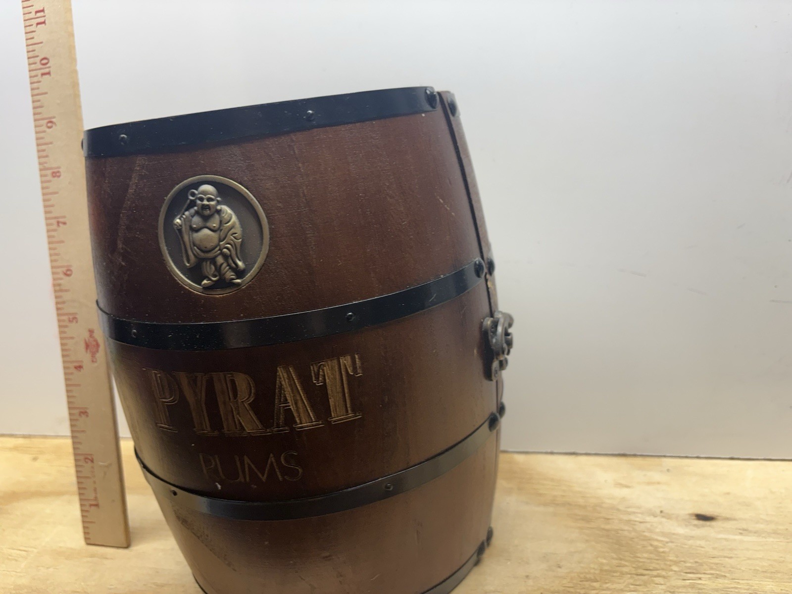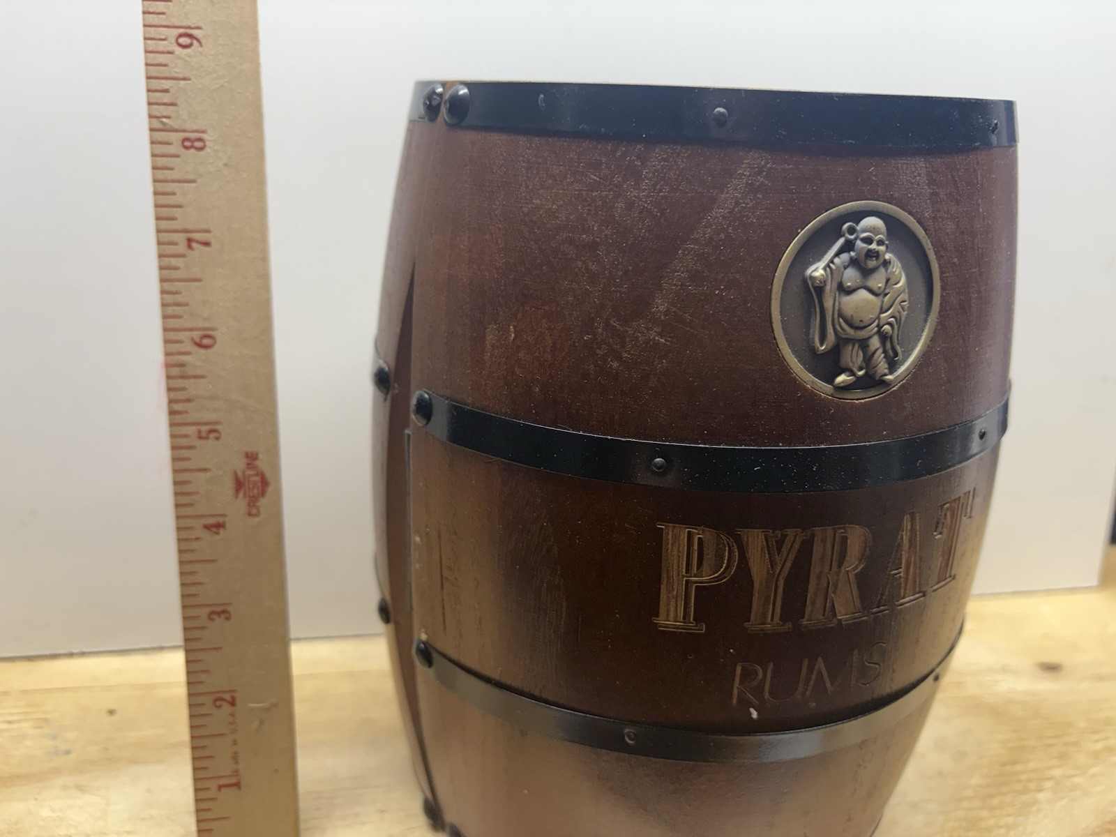 Bring a touch of Caribbean charm to your bar with this Pyrat Rum Wooden Barrel Display featuring a glass decanter with stopper. This promotional display was originally used to present Pyrat XO Reserve Rum and makes for an excellent decorative piece or functional decanter for your favorite spirits. 🛢️ Barrel Size: Approx. 9.5” tall 🍷 Includes: • Wooden barrel display with embossed Pyrat Rum logo & Buddha medallion • Glass decanter with handle and glass stopper • Original padded interior • Printed product info inside the door Condition: Display is in good shape with minor scuffs typical of age. Decanter is clean with no chips or cracks. Hinges and latch work perfectly. Please see photos for full condition details. A great addition to any bar, man cave, or rum enthusiast’s collection!