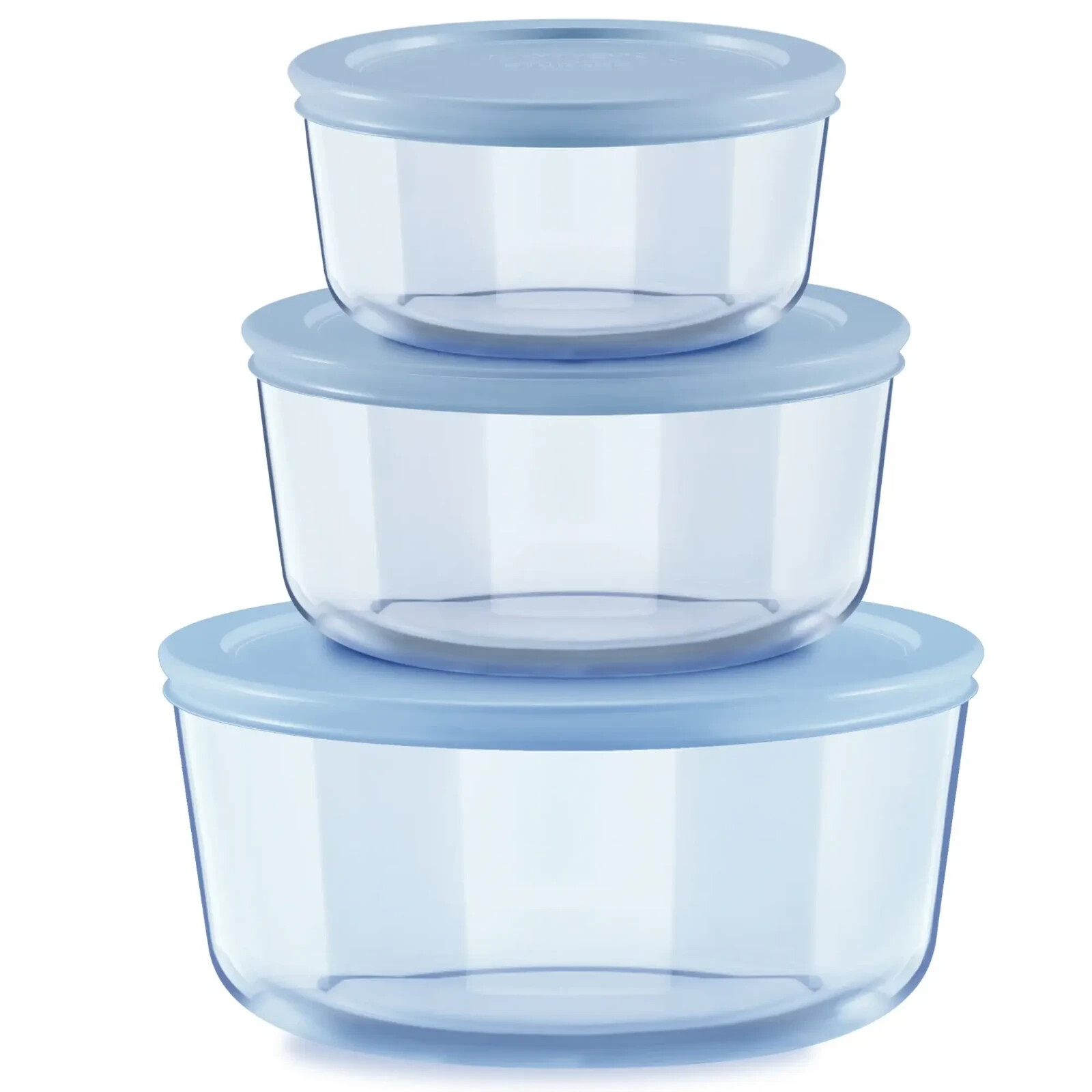 Product details The Pyrex storage we love with the fresh style we crave! We've added a pop of color to our classic glass dishes to help every day feel elevated with serve-worthy appeal. The three sizes in this blue-tinted set are perfect for everything from leftovers and snacks to meal prep and packing to go. Add the coordinating BPA-free lids to keep food fresh and warm until next time. When work is done, just nest and stack these dishes together to save space or look beautiful on display. The tempered Pyrex glass resists stains and doesn’t absorb odors and flavors. It’s also oven, microwave and dishwasher safe. Storage made simply stunning! Set includes: (1) 2-cup Blue Round Glass Dish with Plastic Lid, (1) 4-cup Blue Round Glass Dish with Plastic Lid, (1) 7-cup Blue Round Glass Dish with Plastic Lid 6-PIECE GLASS STORAGE SET INCLUDES: (1) 2-cup blue round glass container, (1) 4-cup blue round glass container, (1) 7-cup blue round glass container, (3) secure-fit plastic lids MODERN UPGRADE: A kitchen storage staple is elevated to a serve-worthy set with stackable design and a fresh pop of color COMPACT DESIGN: Designed to nest together with other sizes for space-saving storage NO LEFTOVER STAINS OR SMELLS: 100% Pyrex glass resists stains and does not absorb food odors or flavors FREEZER, MICROWAVE, AND PRE-HEATED OVEN SAFE: This dishwasher safe Pyrex glass can go directly from room temperature into a preheated oven and heats evenly for consistent results DISHWASHER SAFE: Whether you're baking, serving, storing, or meal prepping, our dishwasher safe tempered glass makes cleanup quick and easy BPA-FREE AIRTIGHT LID: Keep your meals fresh with our secure-fit lids, which are always BPA-free, top-rack dishwasher, and microwave safe PYREX IS THE #1 BRAND OF GLASS STORAGE*: Loved for generations, Pyrex brand glassware is the top brand for all your cooking, serving and storing needs. Source: The NPD Group / Retail Tracking Service, dollar sales, 12 ME December 2022 PYREX WARRANTY: 2-year limited warranty