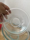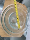 The Pyrex Clear Glass Blue Tint Nesting Mixing Bowls #322 set of 3 is a vintage collection manufactured in the United States during the late 20th century. These retro-style bowls feature a glossy finish and a pressed glass production style. The set includes three round bowls with a clear pattern and a blue tint, perfect for all occasions. Made of glass, these nesting bowls are an original Pyrex product, adding a touch of nostalgia to any kitchen. Refer to the pictures for size , Look at the pictures before making your purchase