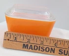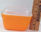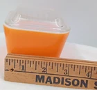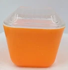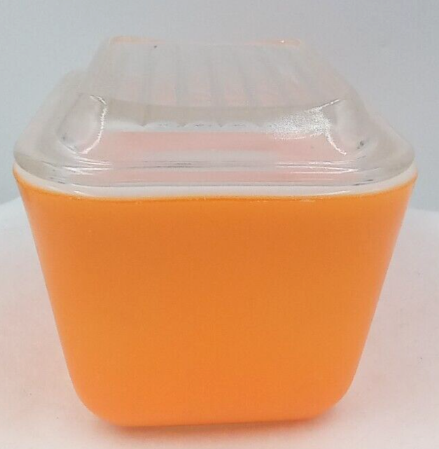 Color: Orange Style: Mid-Century Modern Capacity: 1.5 Cup Material: Glass Brand: PYREX Item Width: 2.75 in Shape: Rectangular Country/Region of Manufacture: United States Features: With Lid Number of Items in Set: 1 Item Length: 3.5 in Pattern: Solid Personalize: No Seller Notes: “Pre-owned! No chips or cracks! Great Shape! Nice Frig Keeper!” Item Height: 3.25 in Theme: Food/Kitchen Type: Refrigerator Keeper