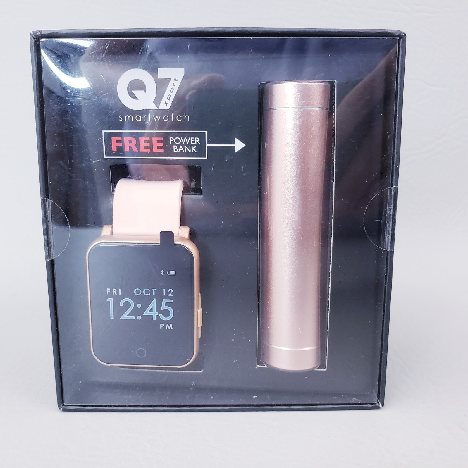 Q7 Sport Smartwatch With Power Bank Blush Pink New in box condition. Compatibility: Compatible with both Android (4.4 and up) and iOS (7.2 and up) smartphones. Features: Includes fitness tracking capabilities like a pedometer, heart rate monitor, sleep tracking, find your phone, and can display notifications for calls, texts, and social media apps. Thank you for looking!