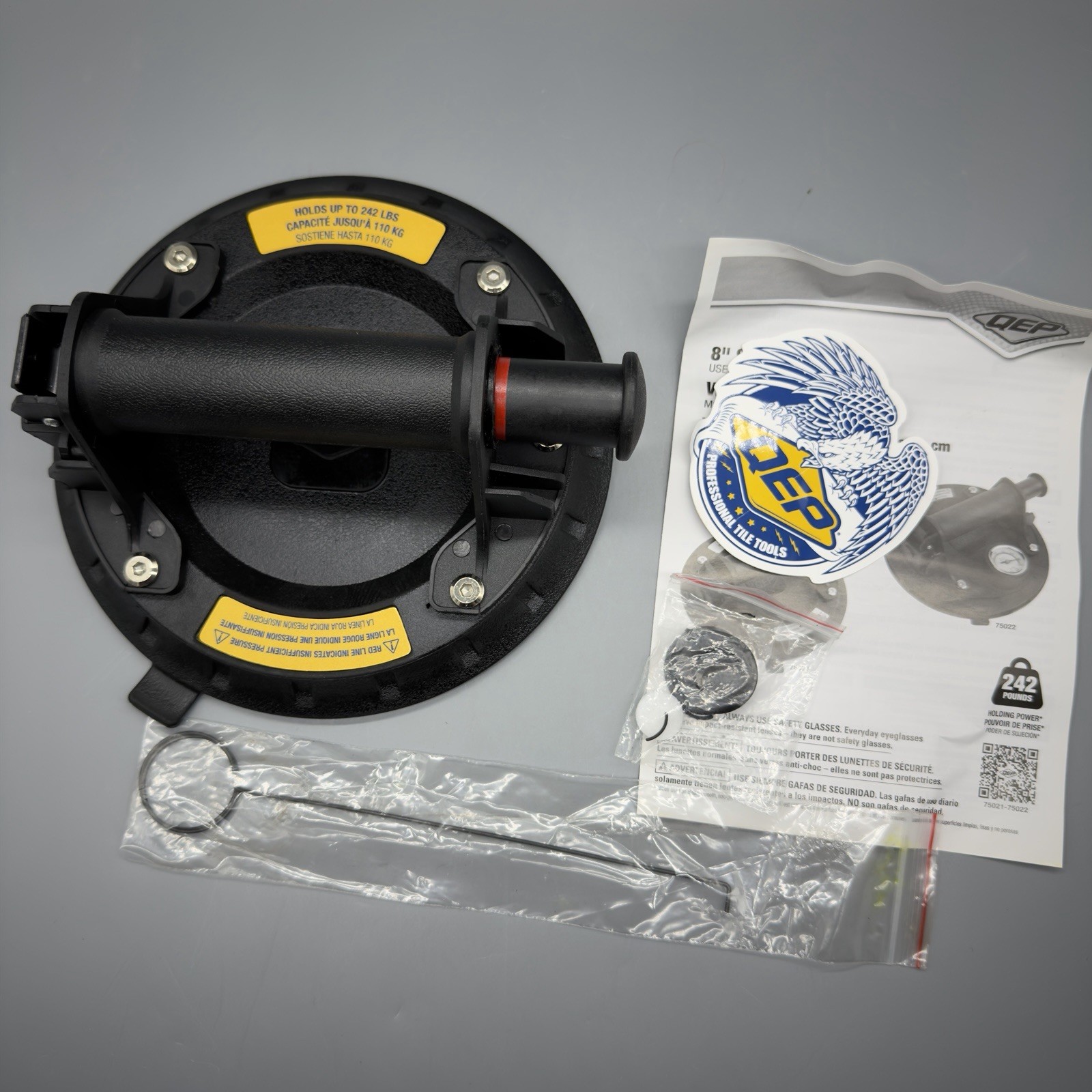 This QEP 8-inch vacuum suction cup (model 75021) is ideal for safely lifting and handling large-format tiles, glass panels, and stone surfaces. It delivers a strong 242 lb lifting capacity, perfect for professional tile setters and contractors. Condition: • Open box – unused item • Missing one latch on the storage case (see photos) • Suction cup and pump mechanism are complete and in excellent condition Specifications: • Brand: QEP • Model: 75021 • Cup Size: 8 inches • Lifting Capacity: 242 lbs • Type: Vacuum Pump Suction Cup • Includes: Protective case (missing one latch)