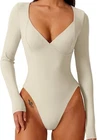 Elevate your wardrobe with this stylish and versatile QINSEN women's bodysuit. Featuring a V-neckline and long sleeves, this basic yet sexy piece is perfect for any occasion, whether party, cocktail, casual or business. The solid color and splashed whit make it easy to pair with any outfit, while the nylon and elastane material provides a comfortable and stretchy fit. With a classic fitted sleeve and snap closer accents, this bodysuit is both flattering and easy to wear. It is lined and suitable for all seasons, including winter, summer, fall, and spring. This size M bodysuit is a must-have addition to your collection.