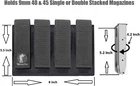 Quad /4 Magazine Pouch - 9MM / 40 S&W / 45 ACP Double Stacked Magazines It will comfortably carry six single or double stacked magazines in any of the above calibers, including magazines carrying up to 18 rounds. This pouch will attach to your belt using the dual 2 1/2" belt loops in the back. Sorry, this pouch will not fit the large Glock 20 & 21 magazines
