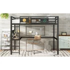 Queen Size Loft Bed Frame with desk storage basket Metal Loft Bed with clock Features 【Side Clock Design】A clock is designed beside the bed, allowing users to easily check the time while getting in and out of bed or moving around its vicinity. This fulfills the daily need to know the time, providing a reference for daily activities. The design occupies no space on the bed itself while delivering practical functionality. 【Bedside storage basket】The headboard features a storage basket for conveniently storing books, phones, and other small items. Equipped with a charging port, it allows you to charge electronic devices effortlessly from bed without searching for an outlet, meeting your daily power needs. 【Pegboard and desk】The space beneath the bed is designed as a desk area, providing a dedicated study and work zone that eliminates the need for an additional desk, thereby saving valuable room space. The included pegboard allows for hanging small tools, decorative items, and more according to your needs, further enhancing the space's storage and display functionality. 【Simple and versatile style】The overall design is sleek and sophisticated, combining black metal with functional components. Its clean lines effortlessly complement modern, industrial, and various other interior styles, adding a touch of minimalist elegance to any space. 【Easy to Assemble】All parts included in your package are indicated clearly. With step-by-step installation manual and pre-drilled holes, you can easily assemble this bed individually. Descriptions Descriptions This metal loft bed is an excellent choice for optimizing space in compact living areas. The storage basket beside the upper bed not only holds books and small items but also features a charging port, allowing you to charge electronic devices from the comfort of your bed—super convenient. The clock on the side makes checking the time effortless while moving around the bed. The lower desk paired with a pegboard creates a dedicated study or work area. The pegboard allows flexible hanging of small items, balancing storage and display. The sturdy metal frame ensures durability and strong weight capacity for safe use. Its minimalist design effortlessly complements various home decor styles, transforming limited space into a multifunctional area for sleeping, storage, and studying—bringing greater convenience and comfort to daily life. Weight & Dimensions Product Type Metal Loft Bed Color Black Size QUEEN Material Metal+MDF Overall Product Dimension 82.7”L*63’’W*68”H Overall Product Weight 106LBS Recommend Mattress Thickness 6'' Number of Package 2 Package Dimension & Weight Please refer to the Specification Level of Assembly Full Assembly Needed Eligible for Hardware Packs Yes Country of Origin China Note All the pictures are taken by actual samples, slight chromatic aberration may occur due to lighting or display. Weight Capacity The table has a weight capacity of approximately 200 lbs, and the net has a weight capacity of approximately 60 lbs.