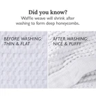 Towel Set: Includes 2 Bath Towels (32 x 62”), 2 Hand Towels (20 x 37”), 2 Wash cloths (14 x 14”). Measurements all before washing, expect 12-15% shrinkage. Super Absorbent & Quick Drying: Made of 100% long-staple Cotton, towels are flat when new. After washing, they shrink to form unique, deep “honeycombs” that instantly wick moisture away and gently exfoliate skin. Dries 40% faster than terry towels, saving time & energy. Lightweight & Compact: Naturally thin, they take up less space in the linen closet, laundry machine, gym bag, beach bag, suitcase, yacht or RV. Lint Free. Snag Free. Odor Free: Breathable weave stays fresh and won’t get stinky, even in damp bathrooms. Plus, they are lint free & snag free. Modern Style: Large honeycomb waffles with a border of tiny waffles blends luxury design with functional fabric. Unlike most waffle towels, it hangs straight even after hundreds of washes.