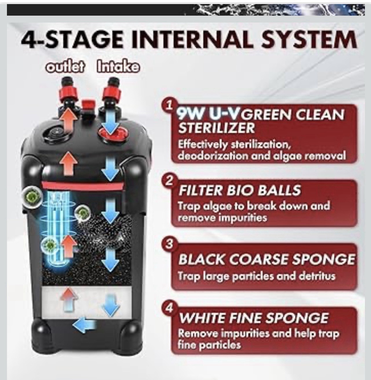 Canister aquarium filter for up to 75 gallon tanks, up to 1000 liter filtration per hour with UV sterilization to reduce harmful baxteria and algae.